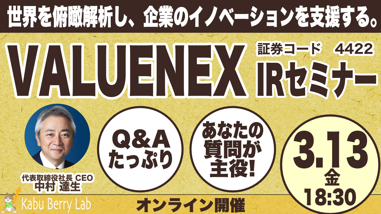 VALUENEX(4422)個人投資家向けIRセミナー|オンライン開催・質疑応答たっぷり|2026.3.13 18時30分【Kabu Berry Lab】