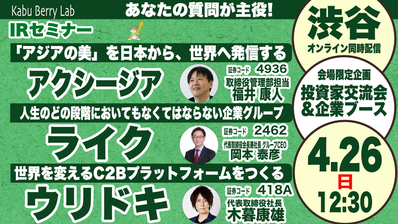 アクシージア(4936)・ライク(2462)・ウリドキ(418A)IRセミナー 渋谷開催 2026.4.26【Kabu Berry Lab】