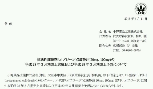 小野薬品工業(4528)のオプジーボの売上はいくら健康保険から負担されるのか調べてみました