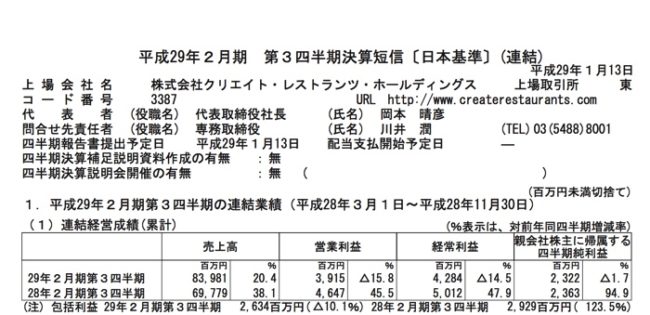 2017/01/17 クリエイト・レストランツ・ホールディングス(3387)