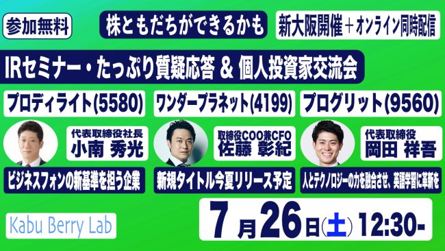 Kabu Berry Lab プロディライト(5580)・ワンダープラネット(4199)・プログリット(9560)IRセミナー+投資家交流会 2025.7.26 大阪開催