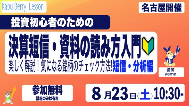 Kabu Berry Lesson 投資初心者のための決算短信・資料の読み方入門講座 [短信・分析編]〜楽しく解説!気になる企業のチェック方法!〜 2025.8.23 名古屋開催