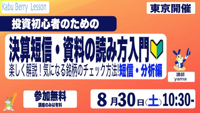 Kabu Berry Lesson 投資初心者のための決算短信・資料の読み方入門講座 [短信・分析編]〜楽しく解説!気になる企業のチェック方法!〜 2025.8.30 東京開催