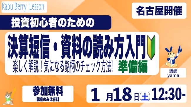 Kabu Berry Lesson 投資初心者のための決算短信・資料の読み方入門講座[準備編] 〜楽しく解説!気になる企業のチェック方法!〜 2025.1.18 名古屋開催