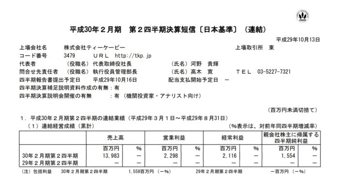 2017/10/14 ティーケーピー(3479) 2Q