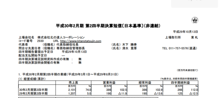 2017/10/15 北の達人コーポレーション(2930) 2Q