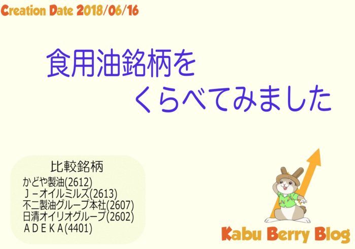 食用油銘柄(かどや製油,J-オイルミルズ,日清オイリオグループ,不二製油グループ本社,ADEKA)を比較してみました
