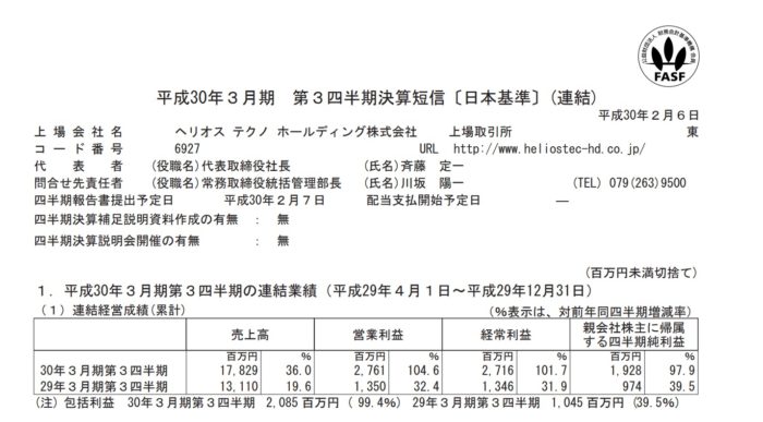 ヘリオステクノホールディング(6927)の露光装置光源ユニットを短信・資料・有価証券報告書で調べてみました