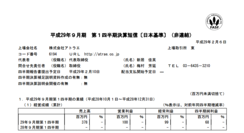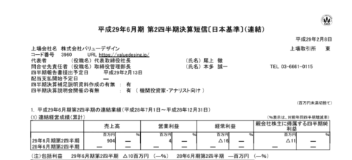 決算短信分析の株ブログ■2017/02/09 バリューデザイン(3960) 2Q