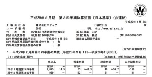2017/01/20 エディア(3935) 3Q