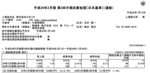 2017/01/23 ロゼッタ(6182) 3Q