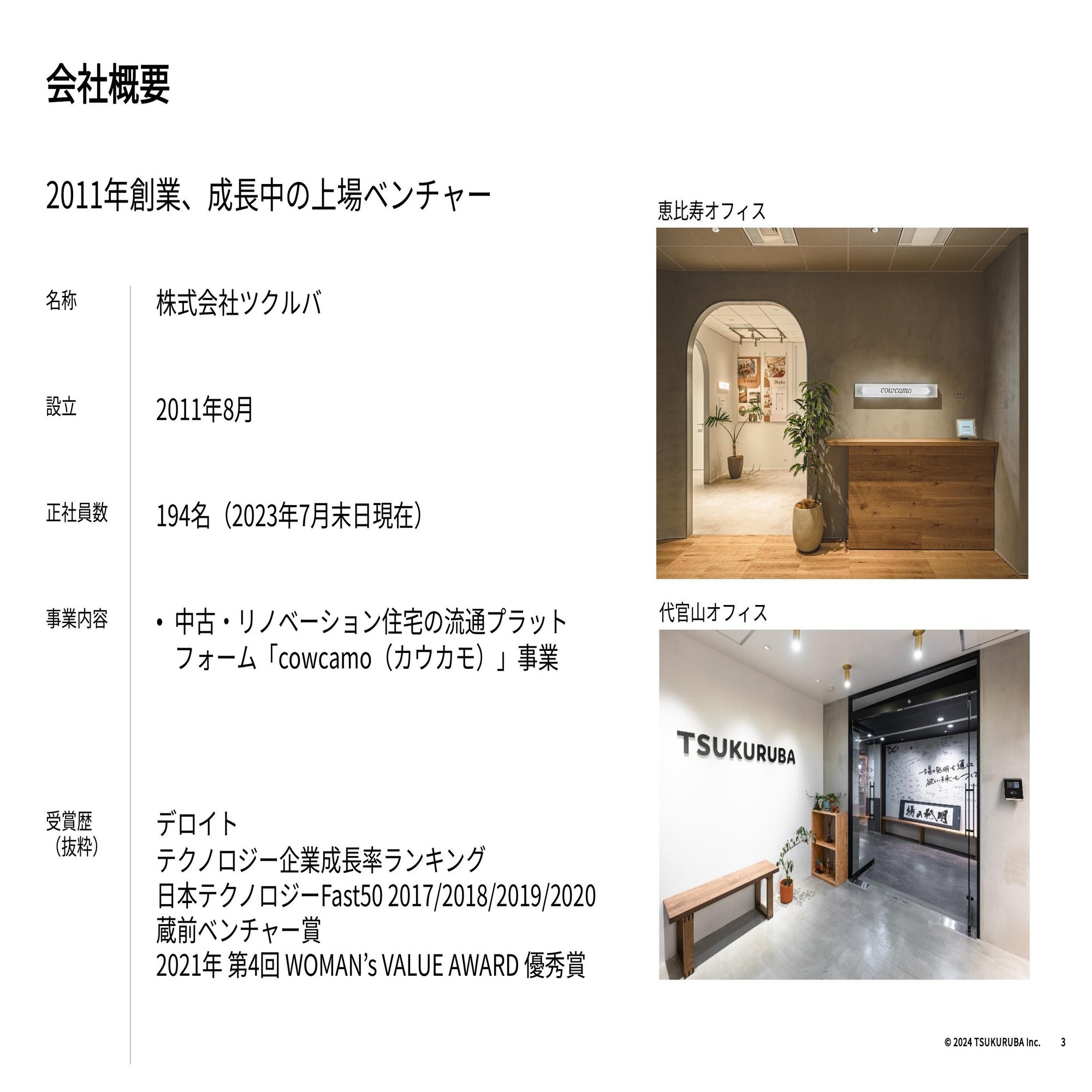 我々ツクルバですが、2011年に創業した成長中の上場ベンチャーです。創業から13年が経ち、そこから今の柱になっているカウカモ事業を立ち上げて9年、上場から5年となります。正社員数は約200名ですが、企業成長率のランキングなどでも何度も表彰いただいております。また、全従業員の半分以上が女性で、女性が活躍する会社としても表彰いただいております。