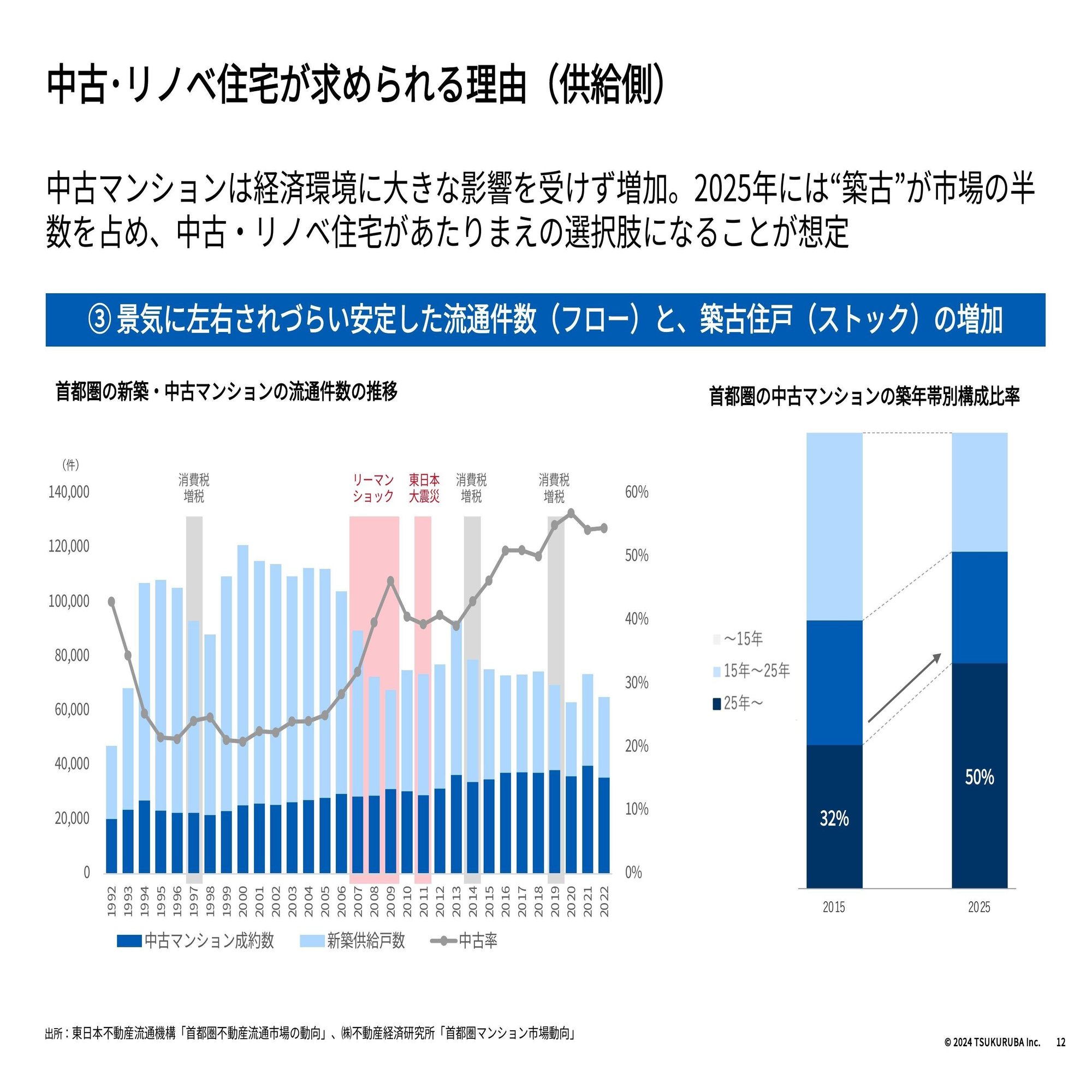 次に供給面についても補足させてください。今回挙げさせていただいたのは、景気に左右されづらい安定した流通件数、そして築古物件数の増加といったところです。左側のグラフは中古マンションの成約数と新築マンションの供給戸数の推移を示しています。新築自体は景気動向に応じて増減があり、例えばリーマンショック時には供給戸数が大きく下がったことが見て取れると思います。ただ、既存住宅、つまり中古マンションといったところは、暮らしの実需の受け皿として必要不可欠でありまして、不動産市場の中で最も景気の影響を受けづらいものとなります。実際左側のグラフを見ていただいても、中古マンション成約数がしっかりと順調に成長しているのが見て取れます。そしてここ数年は中古マンションの流通件数が新築供給戸数を上回り、今後もこのトレンドが継続することが予想されます。