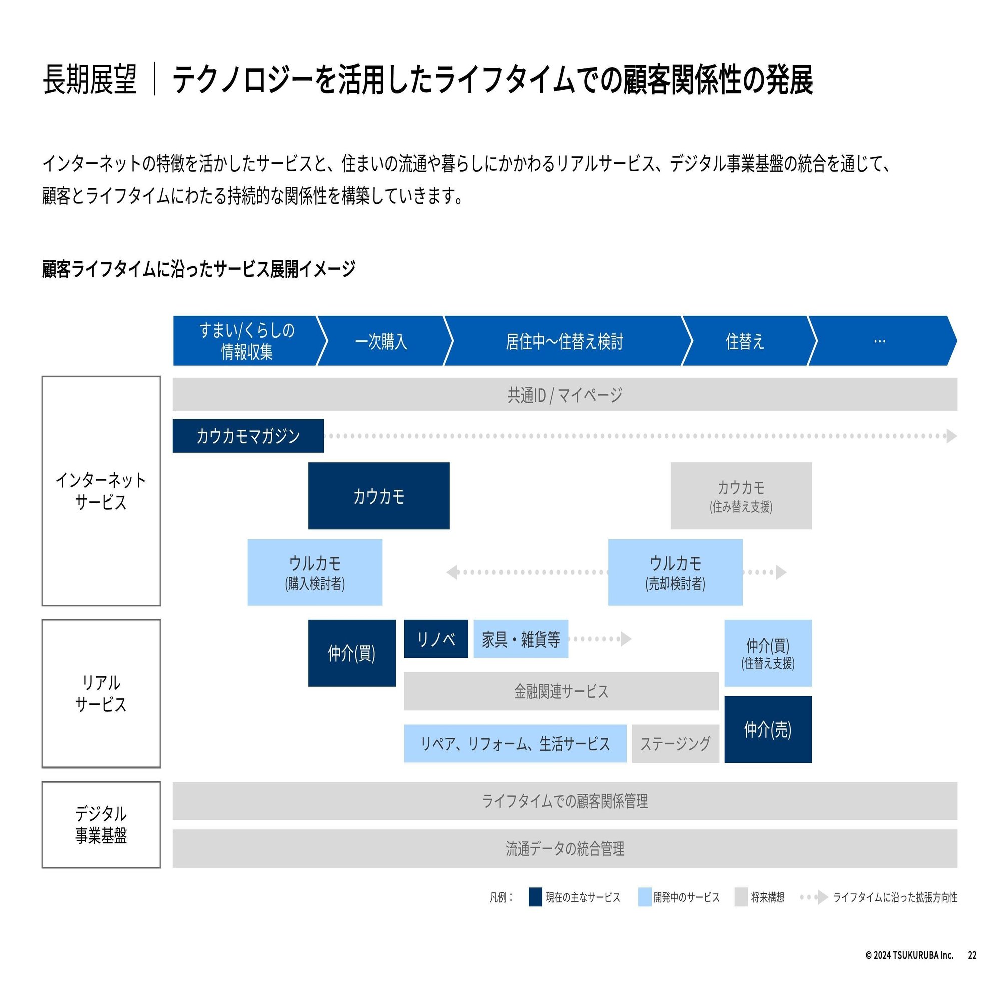 お客様本位の住宅流通とは何なのかという点についてお話しさせていただきます。それは、お客様のライフタイムに沿ったサービスという点に尽きると考え、いち早く構築することを最優先で取り組んでおります。現状では、暮らしを妄想できるカウカモメディア、住宅購入・リノベーション、そして住宅売却時のサービスを提供しています。先ほどの通り、購入前のカスタマージャーニー、購入後のカスタマージャーニーを実際にカバーしています。ただ、ここで今提供しきれていないのは居住中のサービスです。例えばカウカモを通じて住宅を購入いただいた方へのアフターサービス、また住み替える際の住み替えサービス、ここが今ミッシングピースとしてまさに開発に着手しているところです。