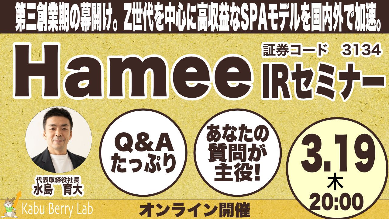 Hamee(3134)IRセミナー&質疑応答 【書き起こし・アーカイブ動画】2026.3.19開催 2026 4/08 IRセミナー動画 文字起こし 2026-04-08 URLをコピーしました! 【登壇者】代表取締役社長 水島 育大 様 書き起こし アーカイブ動画 IRセミナー動画 文字起こし もしよろしければ、拡散していただけると幸いです URLをコピーしました! URLをコピーしました!