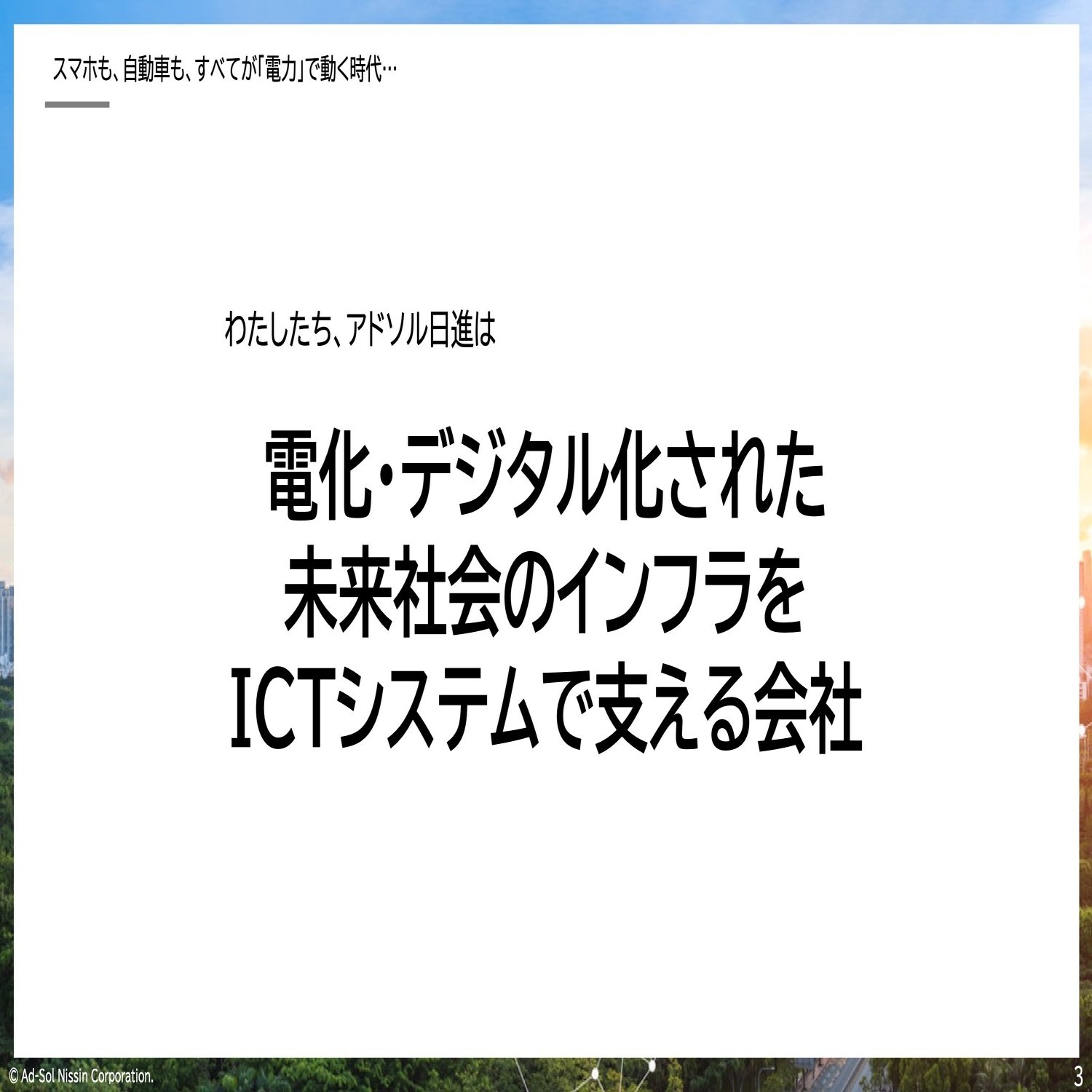 私たちアドソル日進は、今ちょっと話題になっていますけれど、電力の安定供給という、電気を安定的に使えるようにすること、これを支えている会社です。電力会社とは違います。電力をうまく供給するために、それをソフトウェアで制御しているサービスを提供している会社です。