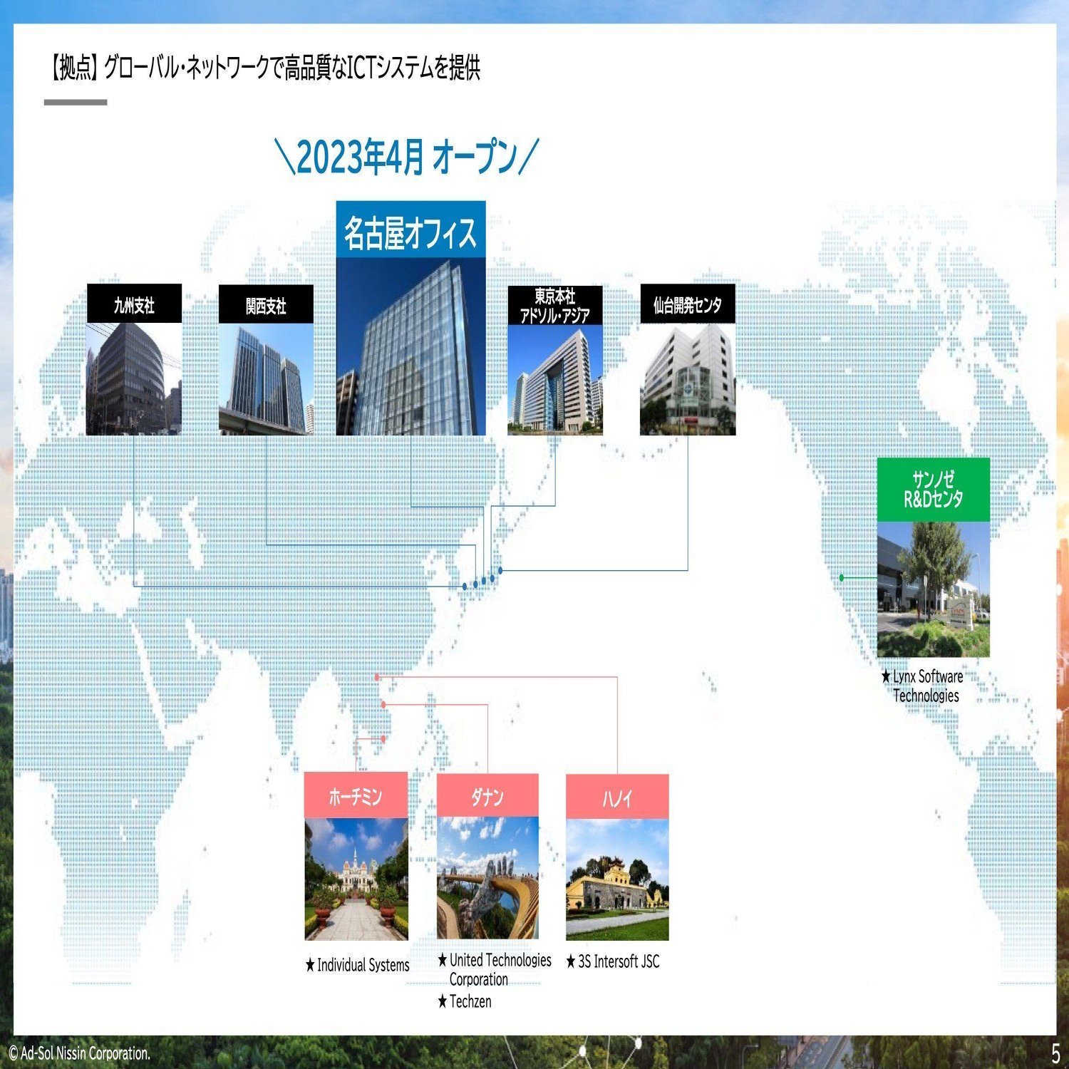 拠点ですけども、東京に本社を構えております。東京、大阪、福岡、名古屋、仙台と、日本に5つの拠点、それとベトナム、ホーチミン、ハノイ、ベトナム中部のダナンで、ICTのシステム開発を実施しています。