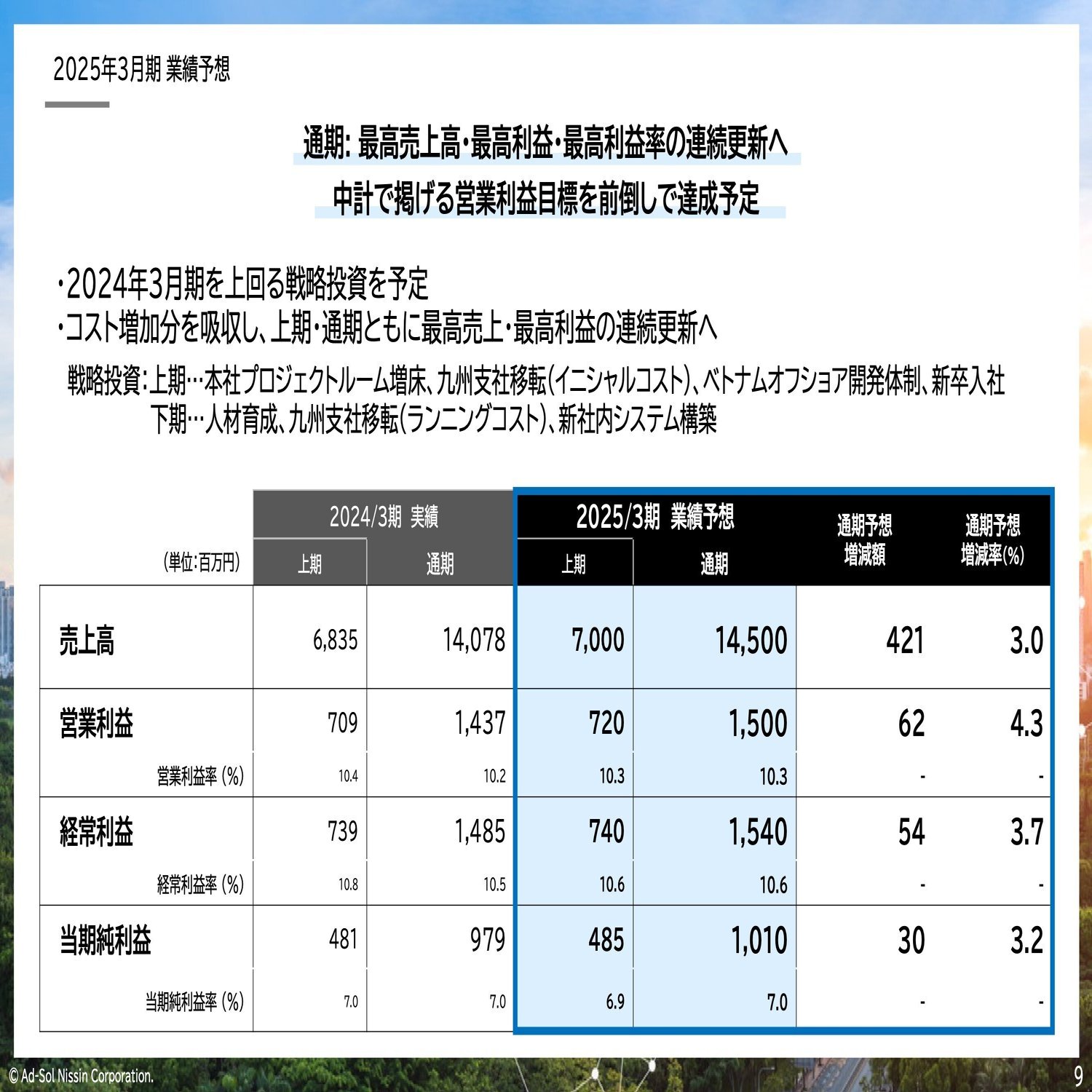 2025年3月期は、中期経営計画の中でもお示ししたとおり、2030年に向けての持続的成長に向けて、戦略投資を行います。人もそうです。いろいろな投資もそうです。地盤固めをしっかりしようという年になっています。