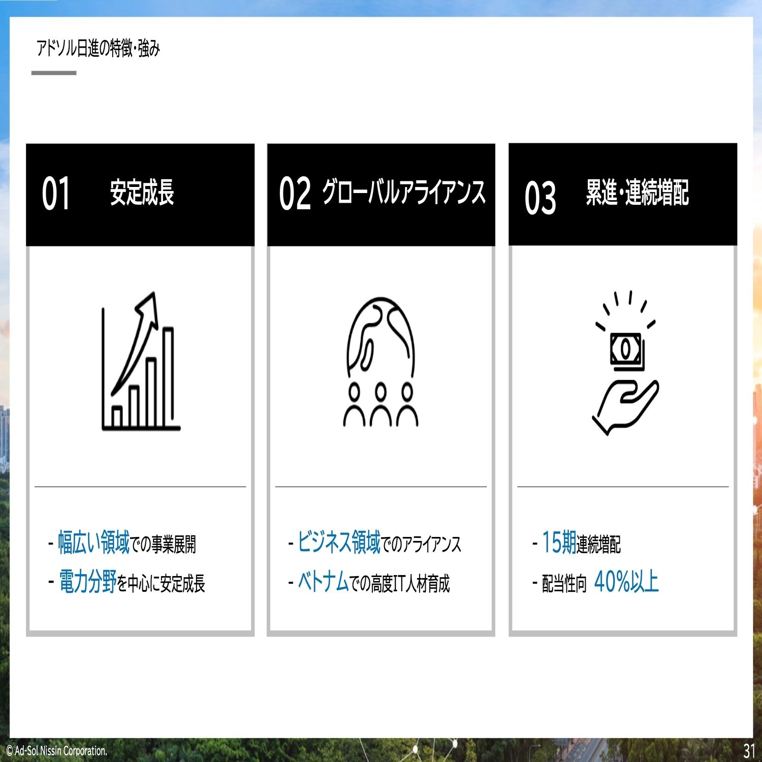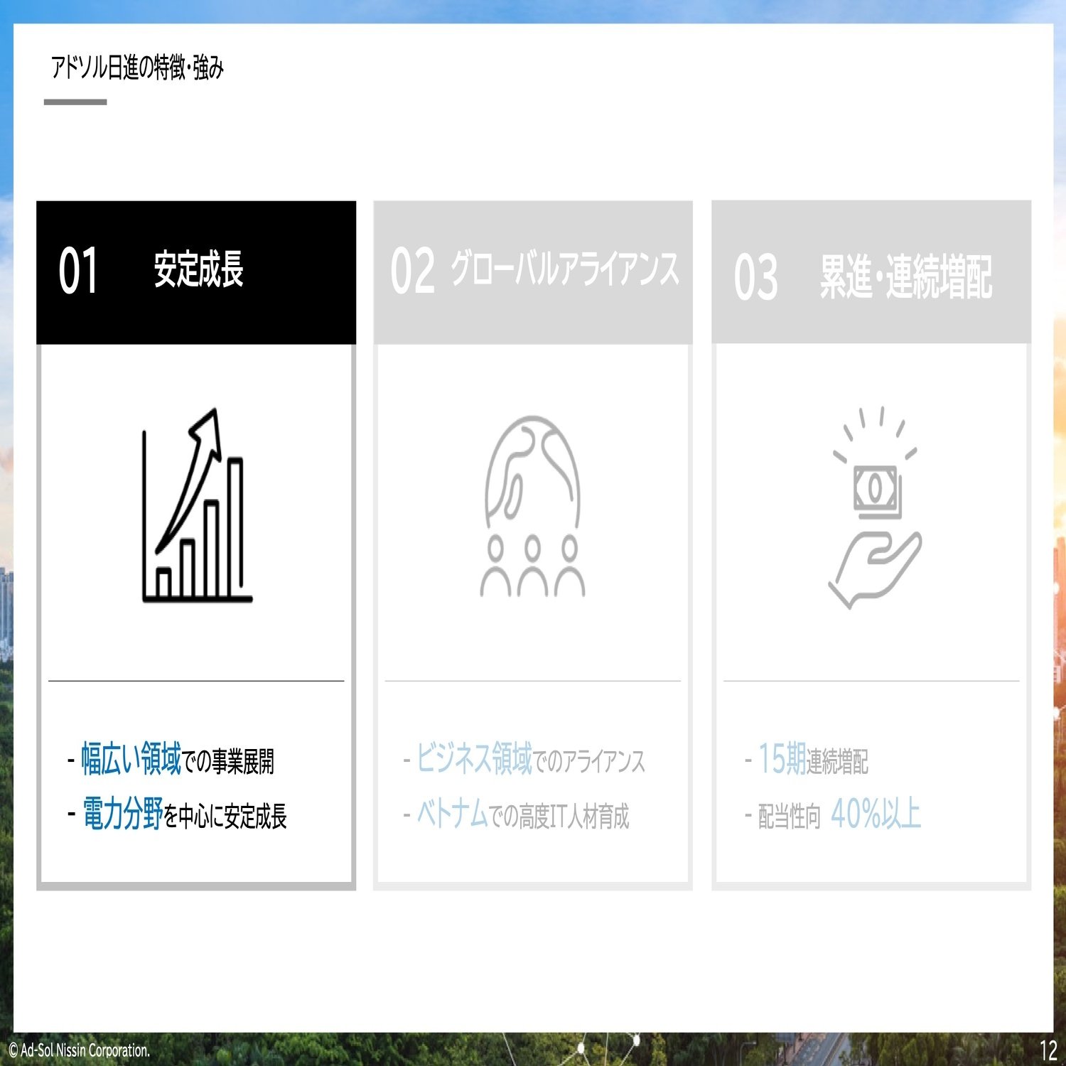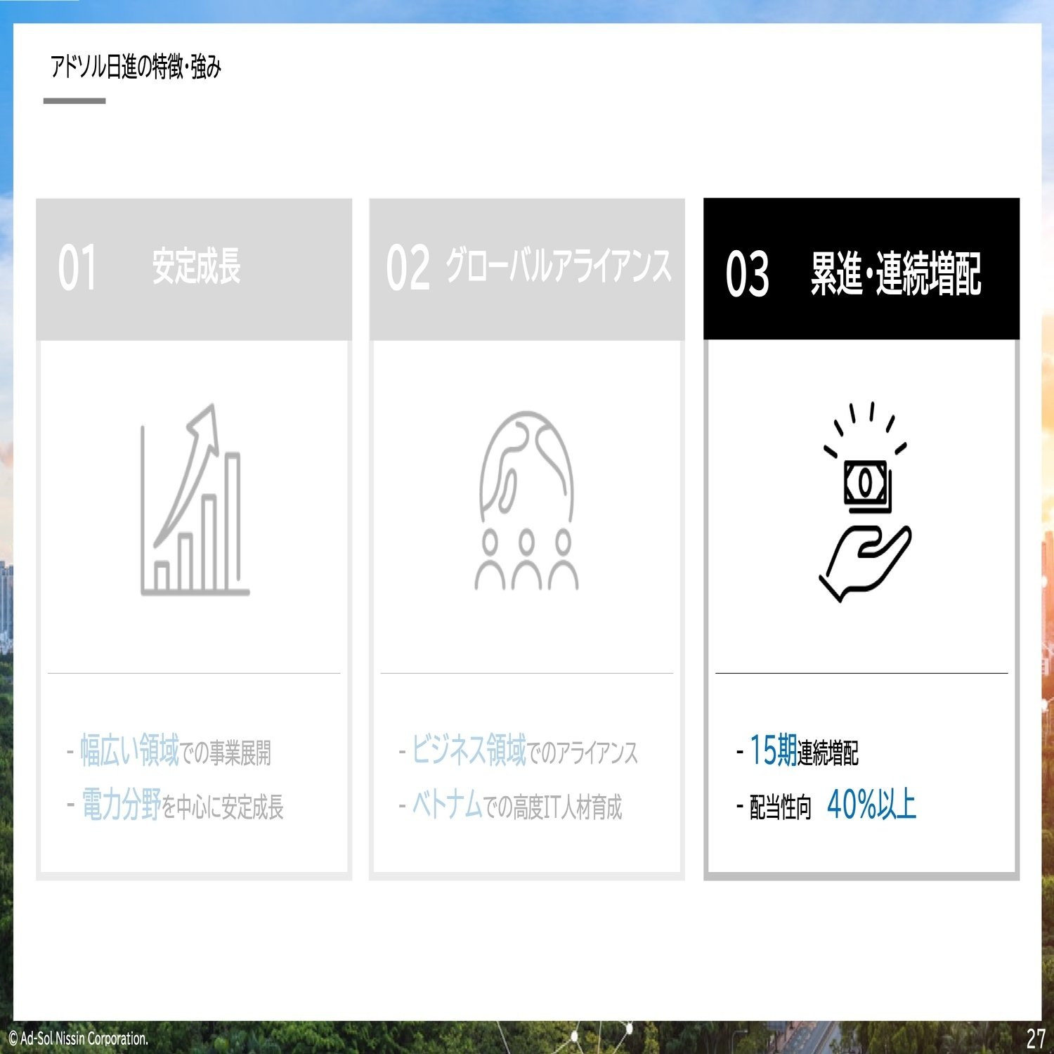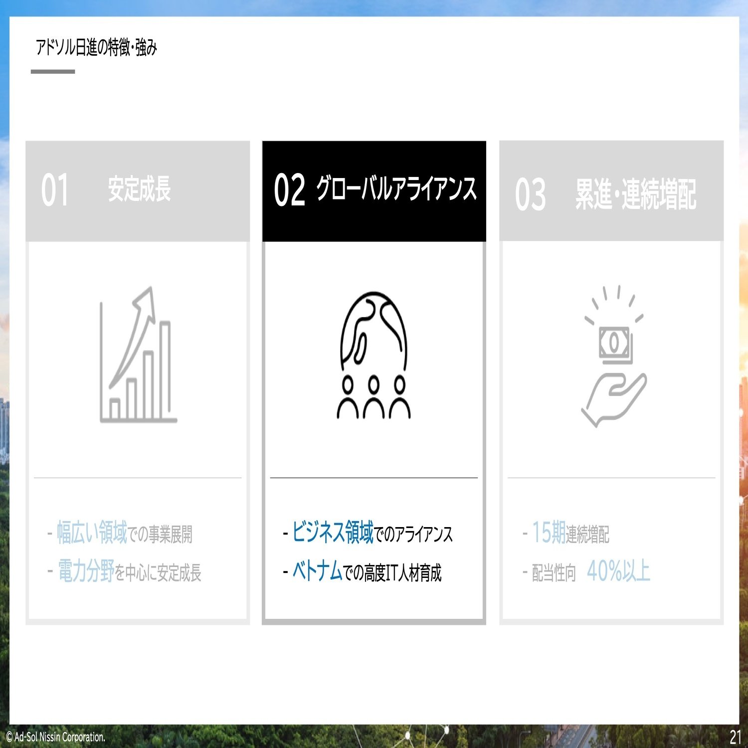 ここまで、アドソル日進という会社がどういう会社かということを中心にご説明させていただきました。社会インフラ、特に電力にビジネスの軸を置きながら成長しています。その成長の背景にはグローバル展開があったり人材育成がありますので、今後もさらに加速させて2030年に向けて成長していきたい。そして株主の皆さんにお応えできるように、今後も業績成長を続け、連続増配に向けて頑張っていきたいと思っておりますので、今後とも変わらぬご支援のほどよろしくお願い申し上げます。
