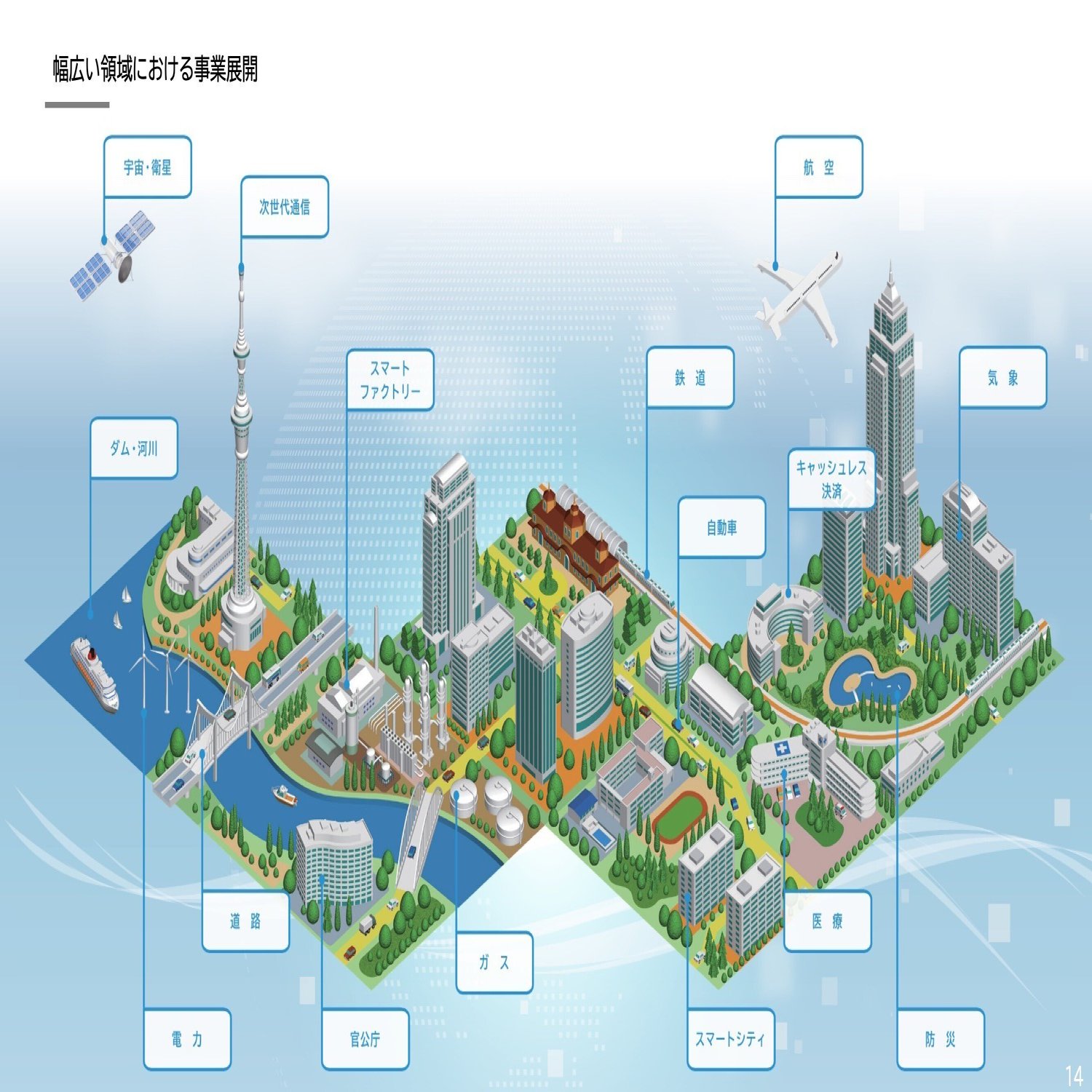 この資料は、私たちが社会インフラ領域とも言っている、ビジネス領域を示しているものです。今お話しした電力以外にも、鉄道だったり、防災関係だったり気象関係だったり、こういう領域も併せてやっています。