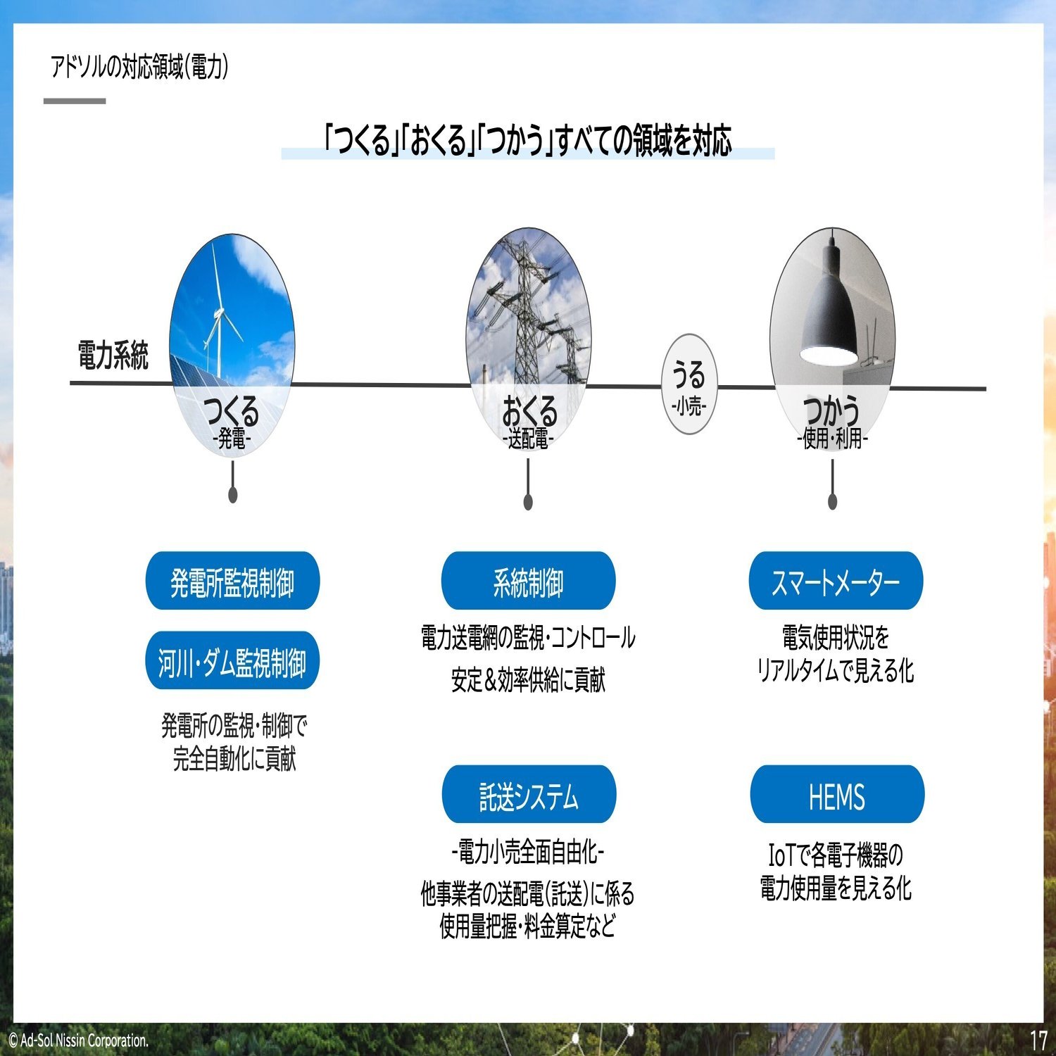 それが今出ている図ですね。電力をつくるところ、電力をおくる、そして電力をつかうというこの一連の流れが電力会社のビジネスです。これで電力会社は成り立っている。でもこれをいかに、ハードウェアじゃなくてソフトウェアで実現するか。この実現がアドソル日進の仕事の一つ。電力をつくる、おくる、つかう、それぞれの領域でソフトウェアを提供しているということですね。