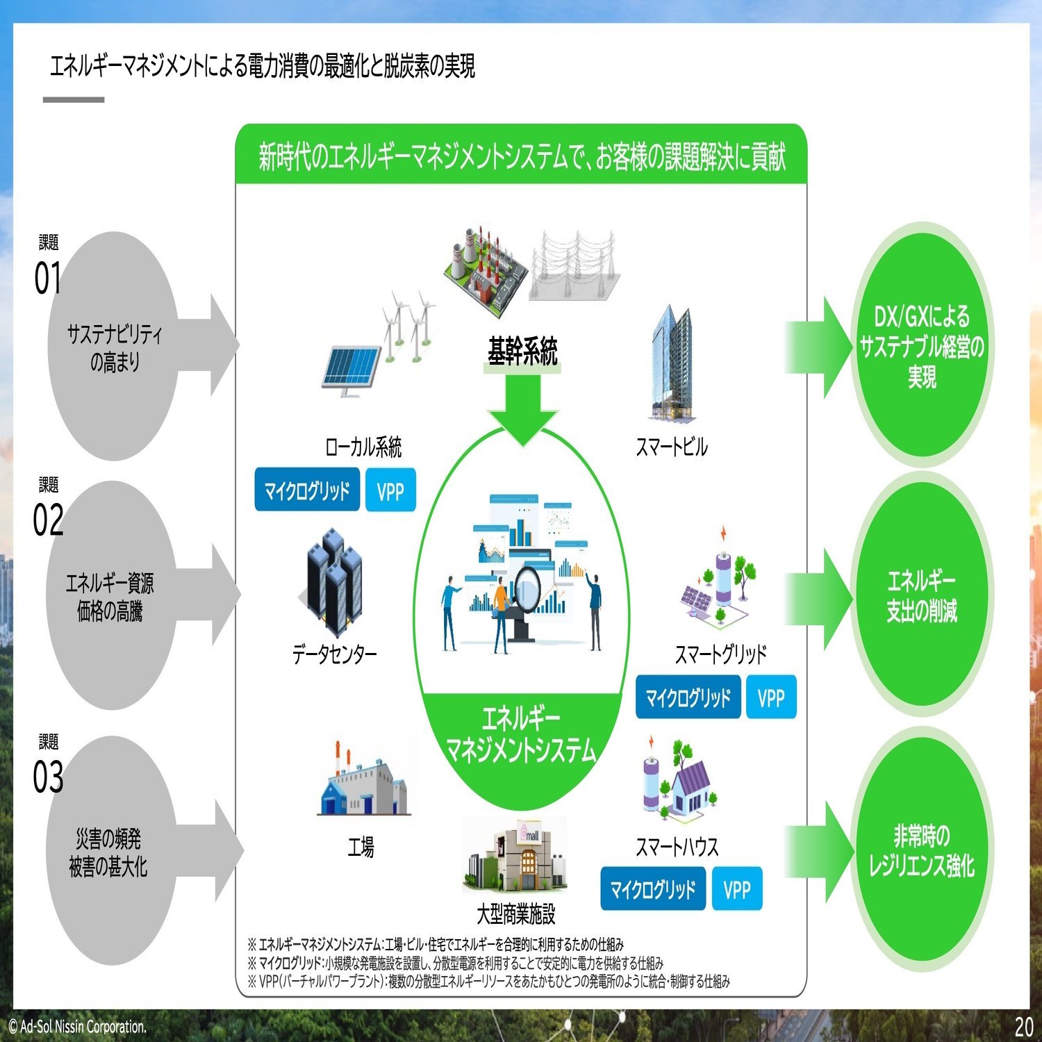 例えば、VPP(バーチャルパワープラント)です。あたかも一つの発電所のように、分散した発電設備を結びつけ、小さな発電所をいくつも作り電力を供給する仕組みです。また、マイクログリッドは、分散した発電所をいかに効率よく送配電していくか、電力を組み合わせていくかという新しい電力の仕組みです。