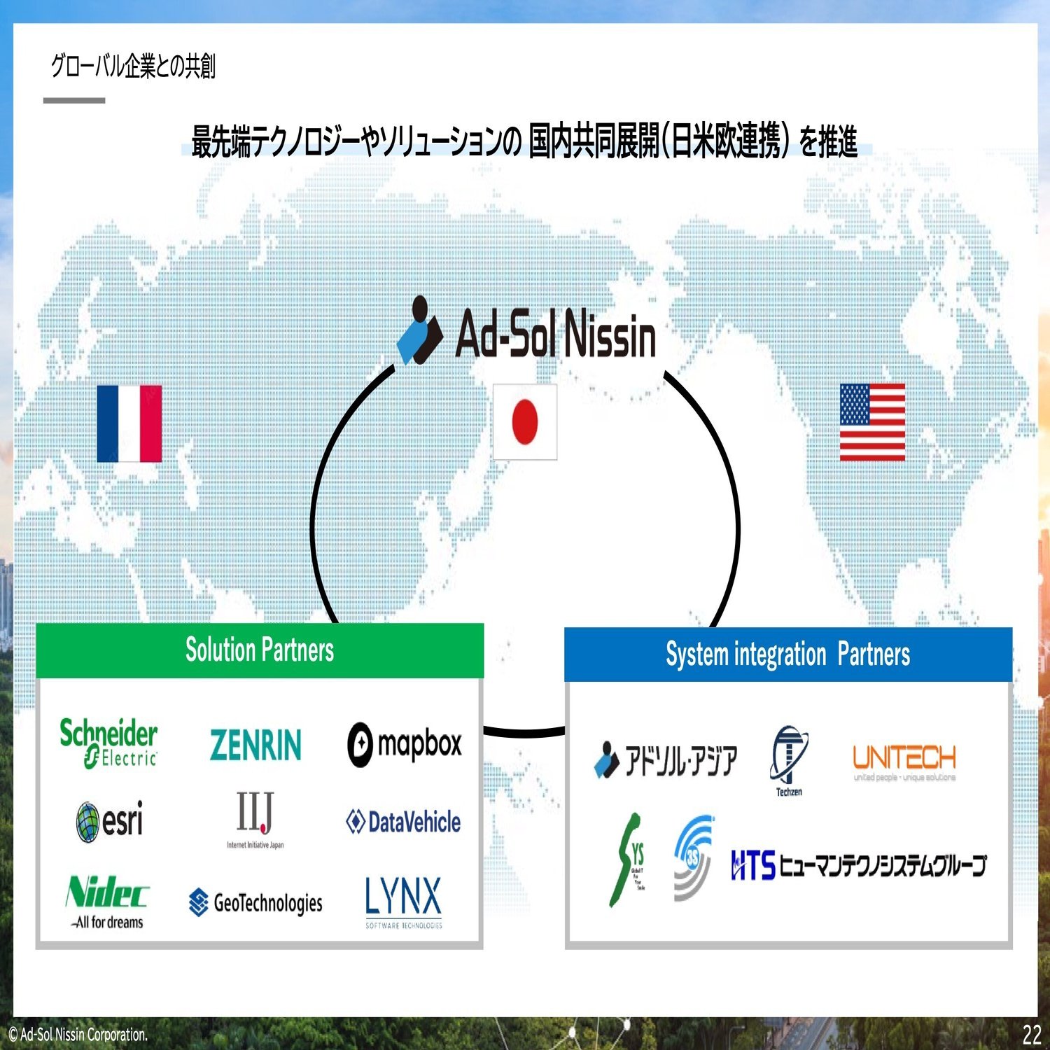 実は、私たちグローバルで、いろいろな企業様と提携(資本提携、業務提携)をしています。私たちが持っている技術力やノウハウを、いかに有効的に使うか。また他社が持っているノウハウと融合して新しいビジネスを創出するか、そういうことを実はずっとやってきています。
