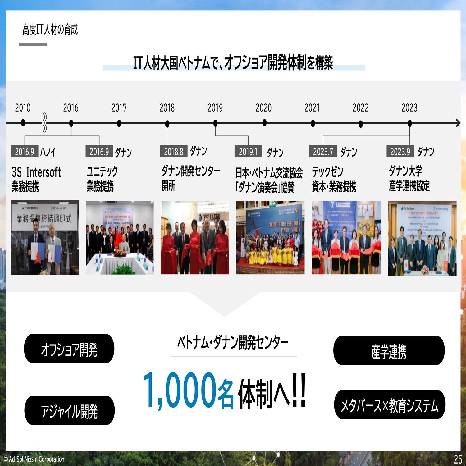 1,000人体制をいつ頃達成できるのかというのはお約束できませんが、非常に積極的に取り組んでいます。先ほど説明した高度IT人材育成や、日本の電力会社向けシステムのベトナムでの開発だけではなく、アドソルアジアという100%子会社が独自のソリューションを提供しています。例えば、教育のシステムだったり、アドソル日進のビジネスとちょっと違いますが、人材を教育するためのプログラムを作ったり、そういうコンテンツを提供しています。ベトナム現地でビジネスを展開することで、人材獲得にもつなげているので、ぜひ早い時期、次の中期計画の中等で達成したいと思っています。