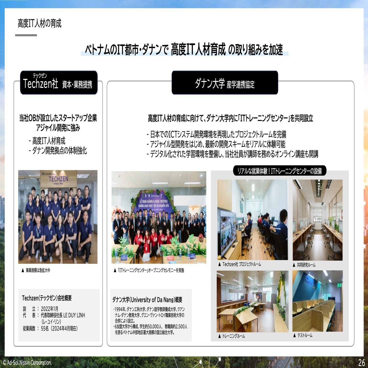 ダナン大学の中に、アドソル日進ITトレーニングセンターというのを作りました。このトレーニングセンターでダナン大学の学生を中心に、高度なIT人材の教育をしています。これはアドソル日進や、100%子会社のアドソルアジアというベトナムでのビジネス・取り組みを統括している会社にベトナムの学生が入社してほしいという思いからでもあります。また、日本全国のIT会社はやはり人材不足で困っているので、当社だけじゃなく他の会社にも、ベトナムからIT人材を提供し、日本のIT業界がもっと盛り上がって、アメリカの大手IT企業に負けないぐらいのIT大国にしていきたいなという思いもあり、トレーニングセンターを作りました。