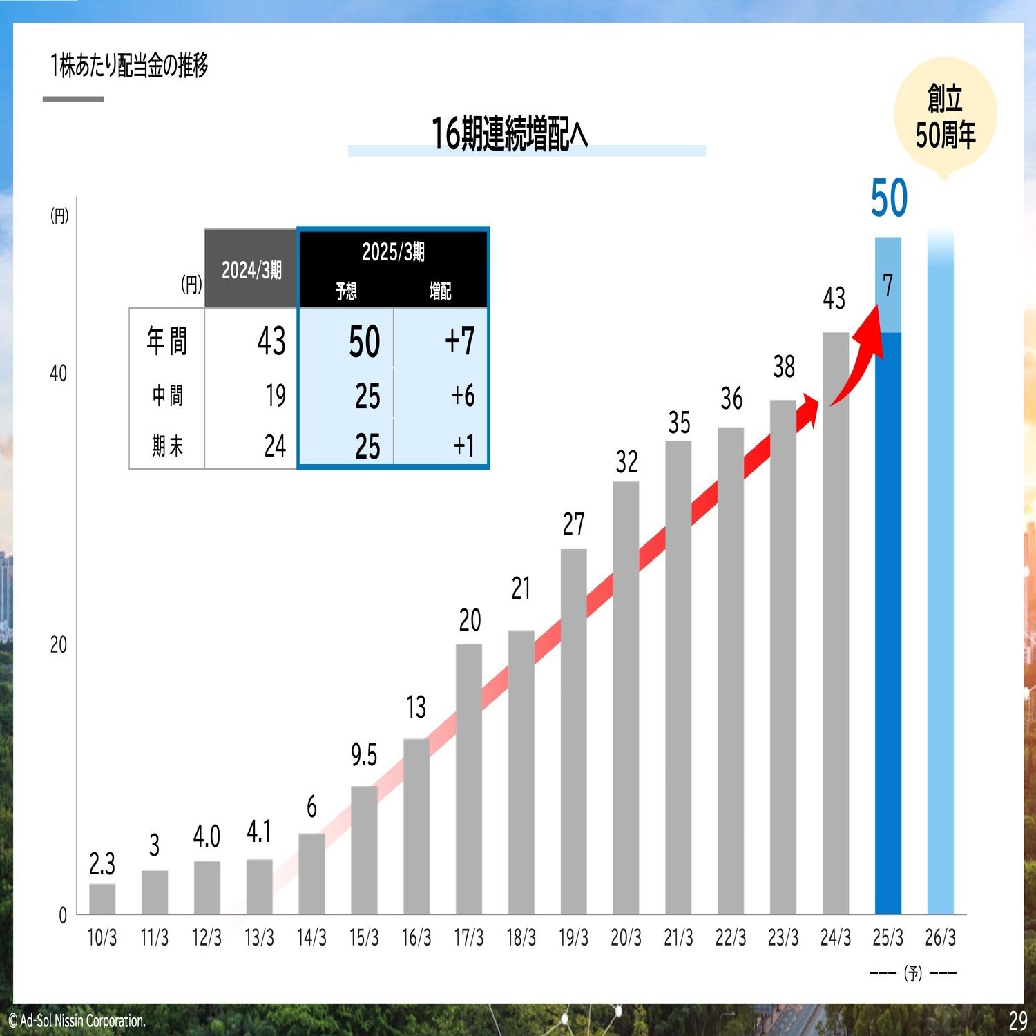そして今中期計画の3年の2年目となりますけれども、最終年度は創立50周年になるんですね。ここで16期連続増配が達成できるように今経営を進めています。今後も投資家の皆様方に魅力ある株主還元の在り方、特に内部留保とか成長投資のバランス、またROEの向上、財務の健全性などを踏まえてですね、多角的に議論してこれから検討していきたいと思っています。