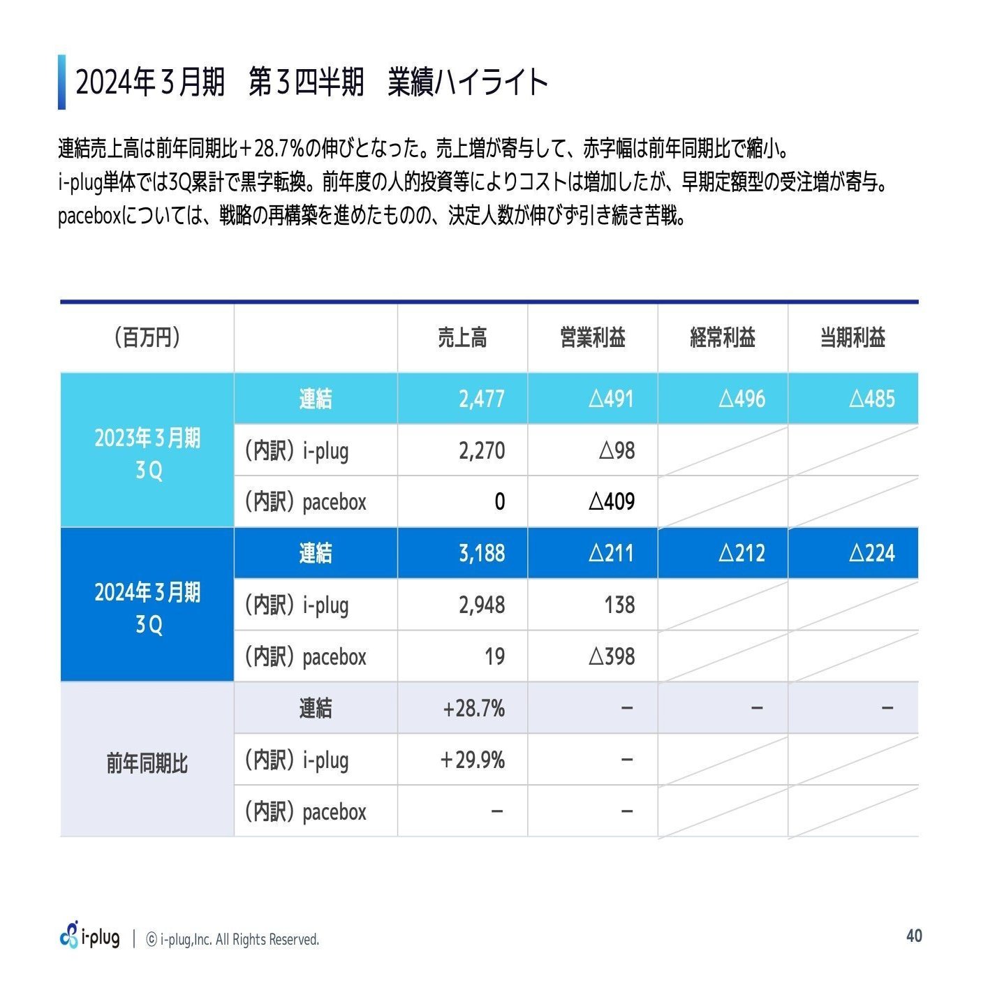 第3四半期の連結売上高は31億8,800万円で、i-plugが29億4,800万円、paceboxが1,900万円となっています。前年同期比では連結売上高が28.7%増となりました。先ほどお伝えした通り、PaceBoxはかなり苦戦していますので、一旦サービスを終了して、成長戦略を考え直して再チャレンジしたいと考えています。
