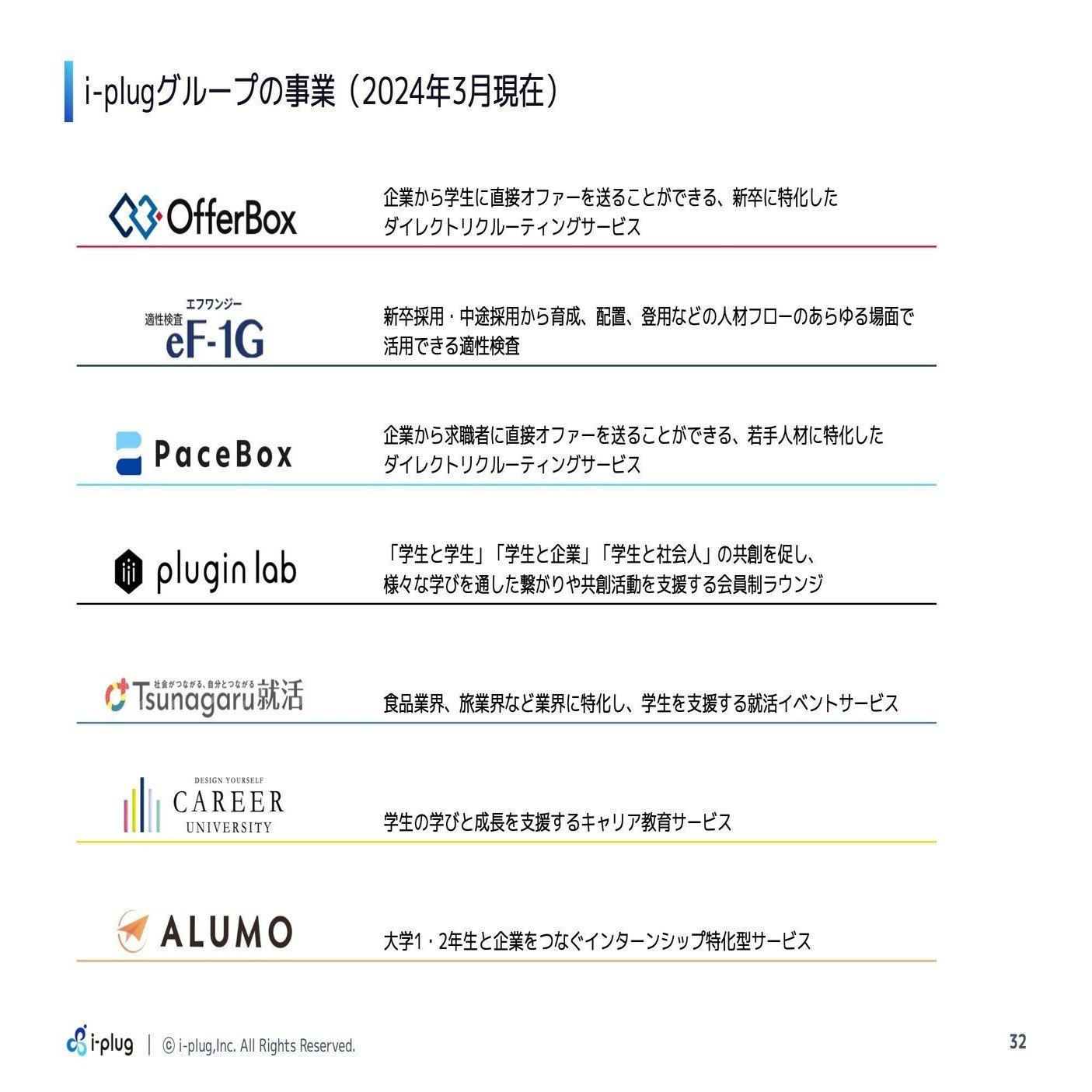 現在、OfferBox以外にも、適性検査・アセスメントの「eF-1G」、若手の転職支援サービスの「PaceBox」、大学生のキャリア醸成を支援する「plugin lab」、食品業界に特化した就活支援サービスの「Tsunagaru就活」、学生の学びと成長を支援するキャリア教育サービスの「キャリア大学」、大学1、2年生向けインターンシップの「ALUMO」など、様々なサービスに取り組んでいます。