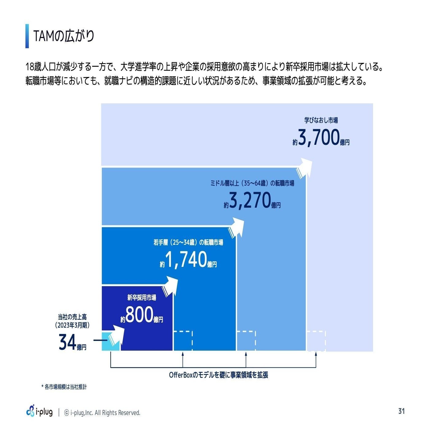 現在は大学生の就職活動支援にフォーカスしていますが、その前後、大学生の領域と転職の領域にもチャレンジしています。新卒採用市場のTAMから、若手・ミドル以上の転職、学び直しと、チャレンジできる市場規模を大きくしながら、成長していきたいと考えています。