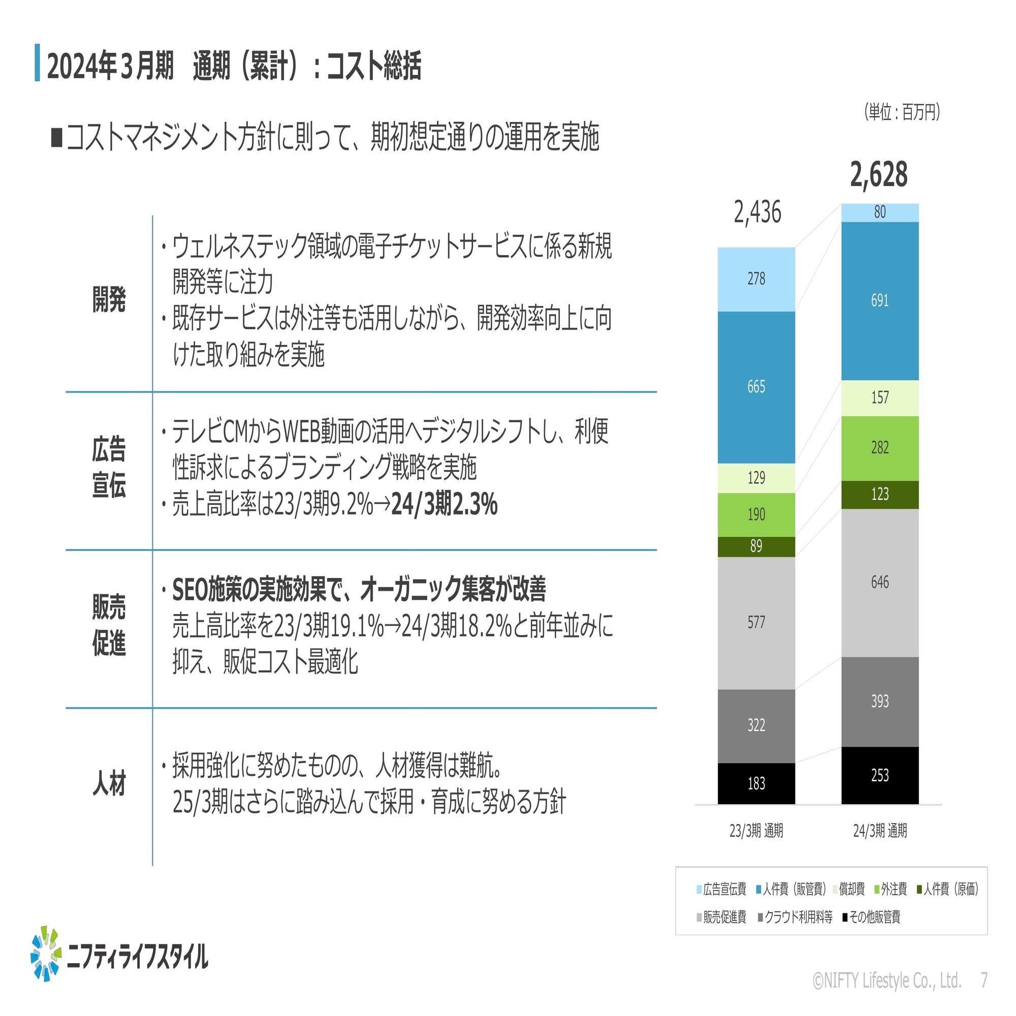 A. 2023年3月期と2024年3月期に行った施策は時系列のものだと認識しています。2023年3月期はテレビCMでニフティ不動産の認知度を高め、その延長線上で2024年3月期は認知いただいた方によりニフティ不動産を使っていただけるような機能訴求、個別のシチュエーション訴求をしました。現状のSNSを活用した広告宣伝については一定の成果が出ていると評価しています。