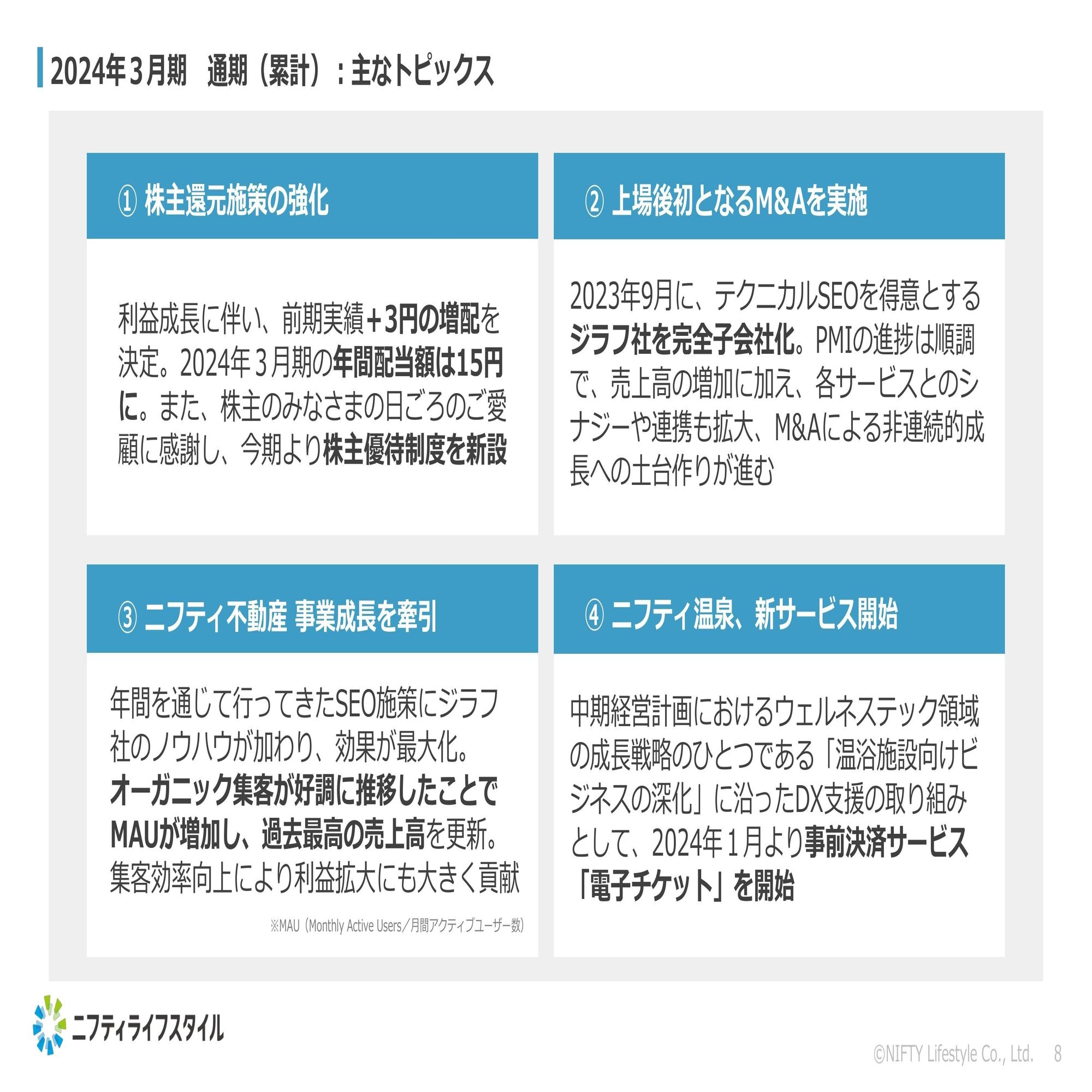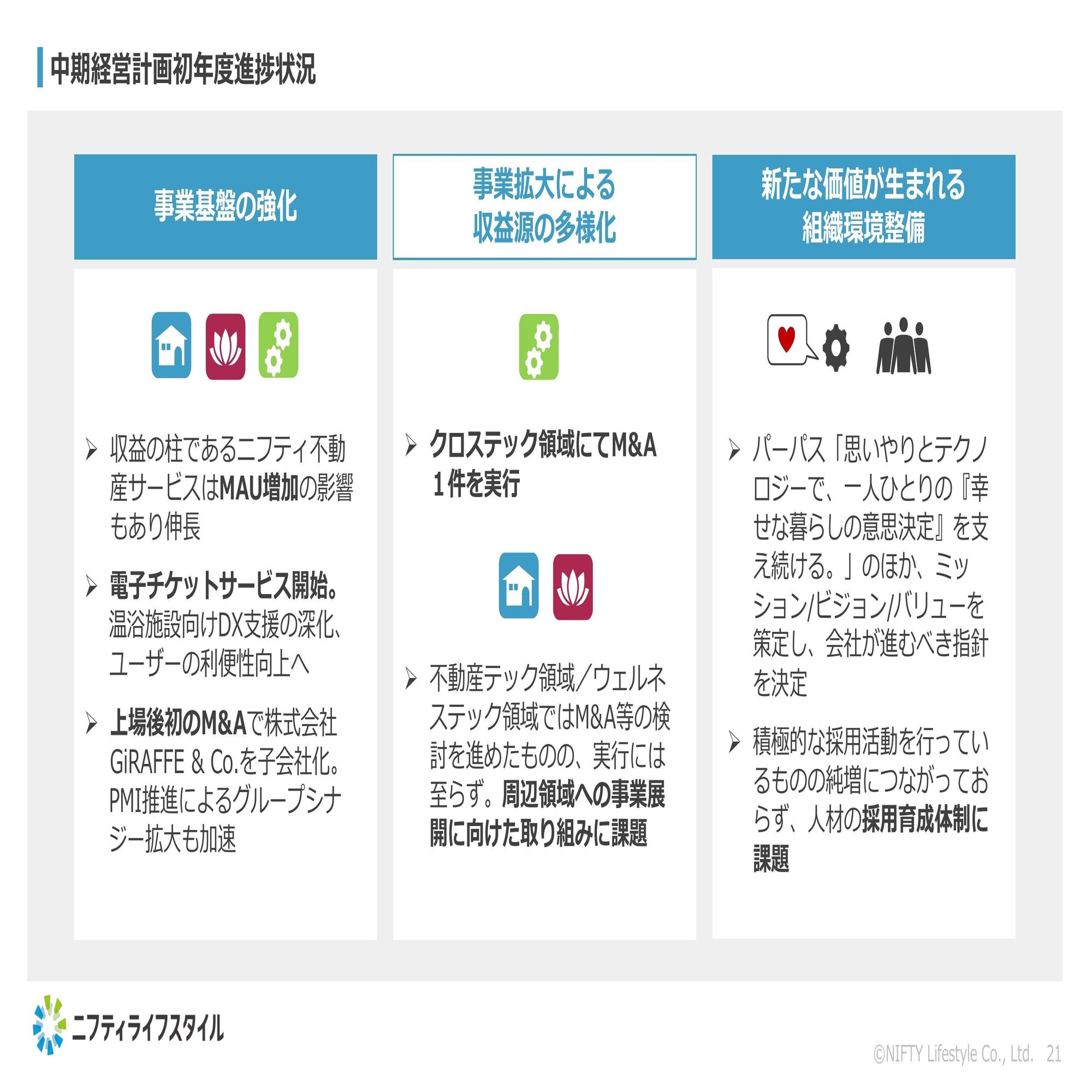 まず左側の事業基盤の強化では、ニフティ不動産が非常に好調に推移しました。また、電子チケットのサービスも開始し、上場後初のM&Aもしっかり実行できてグループシナジーの創出に取り組めたというところは非常にプラスだったと思っております。
