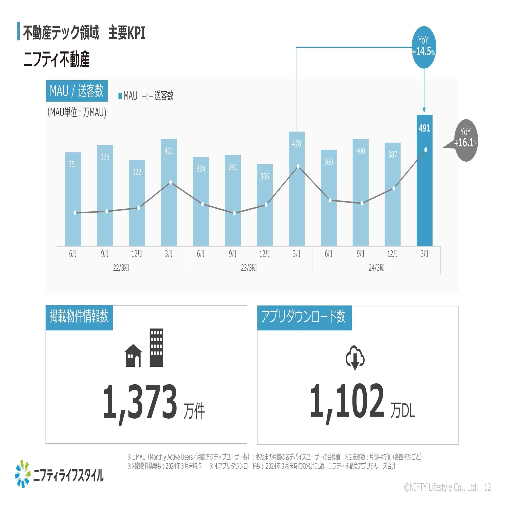 また右下のアプリのダウンロード数につきましては、昨年6月に1,000万ダウンロードを突破したということがありましたが、3月末におきましては1,102万ダウンロードというところまで来ております。不動産のアプリにつきましては、当社のニフティ不動産の予備軍と認識しておりますので、ここは引き続ききちんと伸ばしていければと考えている次第でございます。