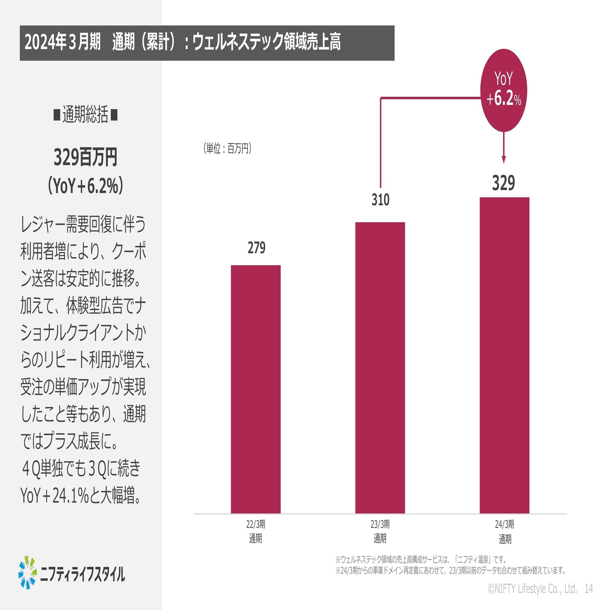 こちらにつきましては、主には温浴施設で使えるクーポンの送客売上というところが中心になっているのですが、今期につきましてはこれに加えまして体験型広告というビジネスもしっかり伸ばすことができたというところで、このあたりが寄与して年間6.2%増という着地になっているという状況でございます。
