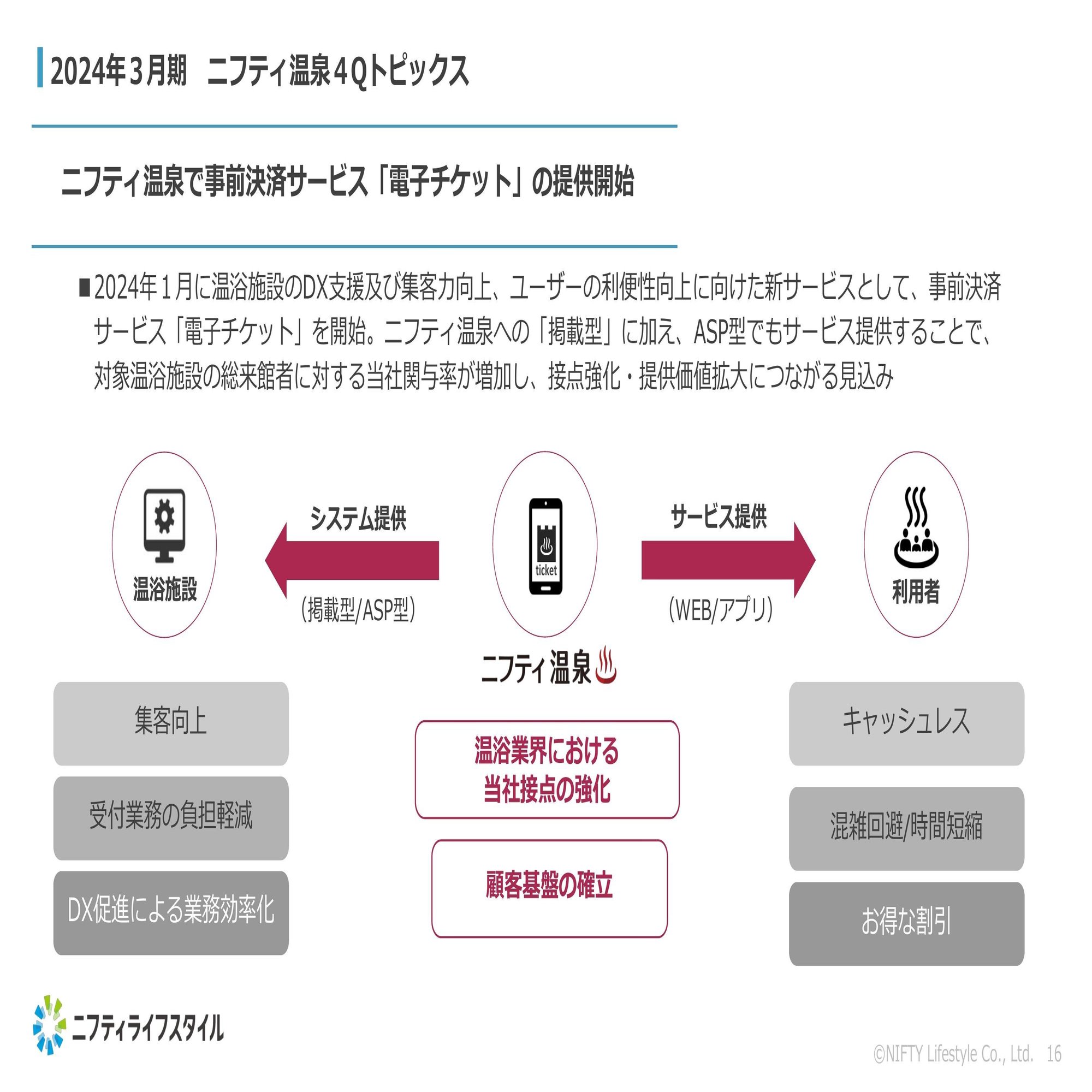 またニフティ温泉の第4四半期のトピックスになりますが、1月17日にIRリリースの方でお知らせさせていただいたとおり、ニフティ温泉で事前決済サービス「電子チケット」の提供を開始しております。こちらにつきましては、対温浴施設、対利用者向けの提供価値というのはご覧のとおりになっております。