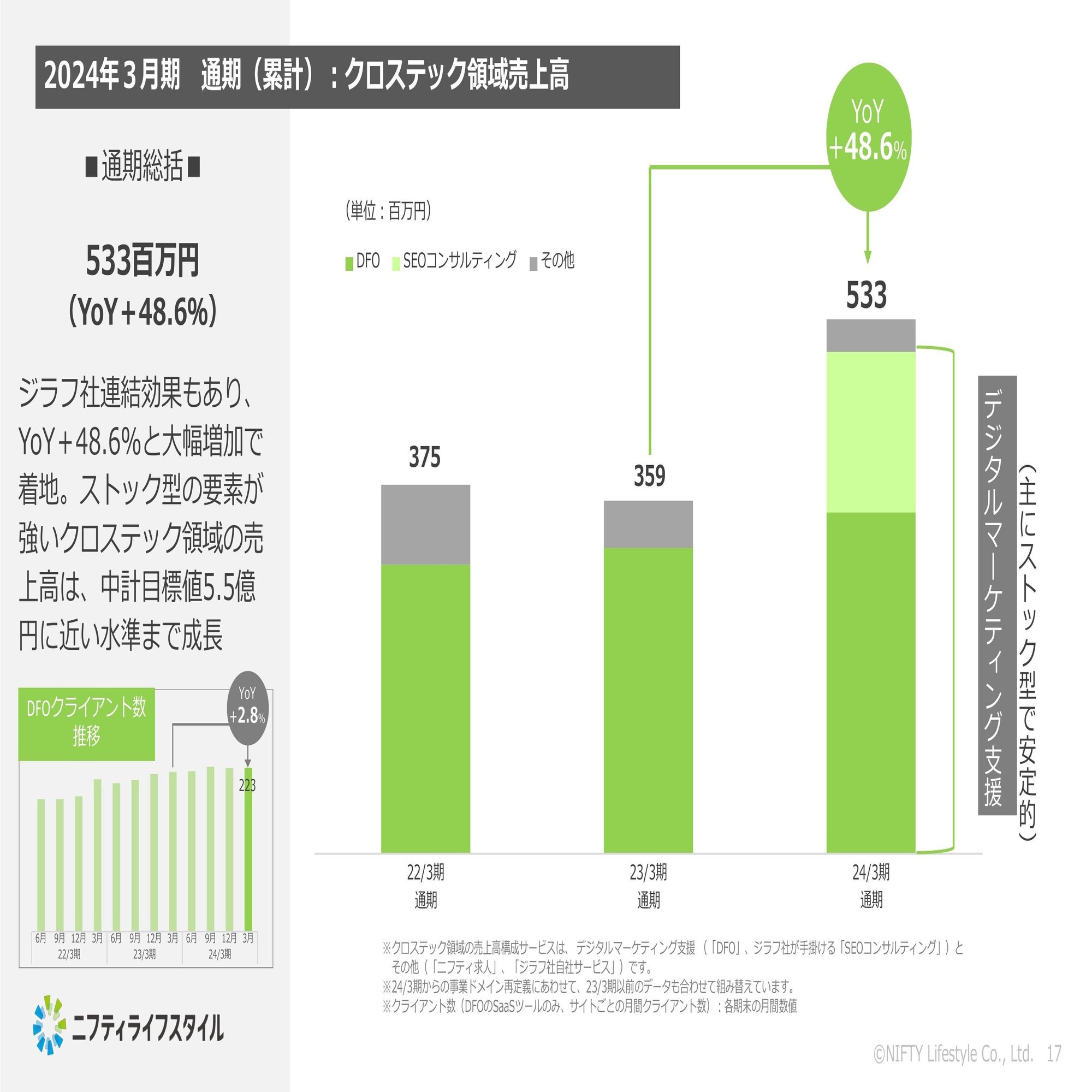 要因としましては、昨年9月に連結しましたジラフ社の下期の寄与がきちんと効いているというところもありますし、DFOにつきましても安定的・継続的に業績を伸ばしてこられたというところがポイントになっております。デジタルマーケティングにつきましては、要素としてはストック型の収益の比重が大きいので、クロステック領域を伸ばしていくことは売上の安定化というところにも寄与するということで、ここも1つ大きなポイントとして認識をしているといったところでございます。