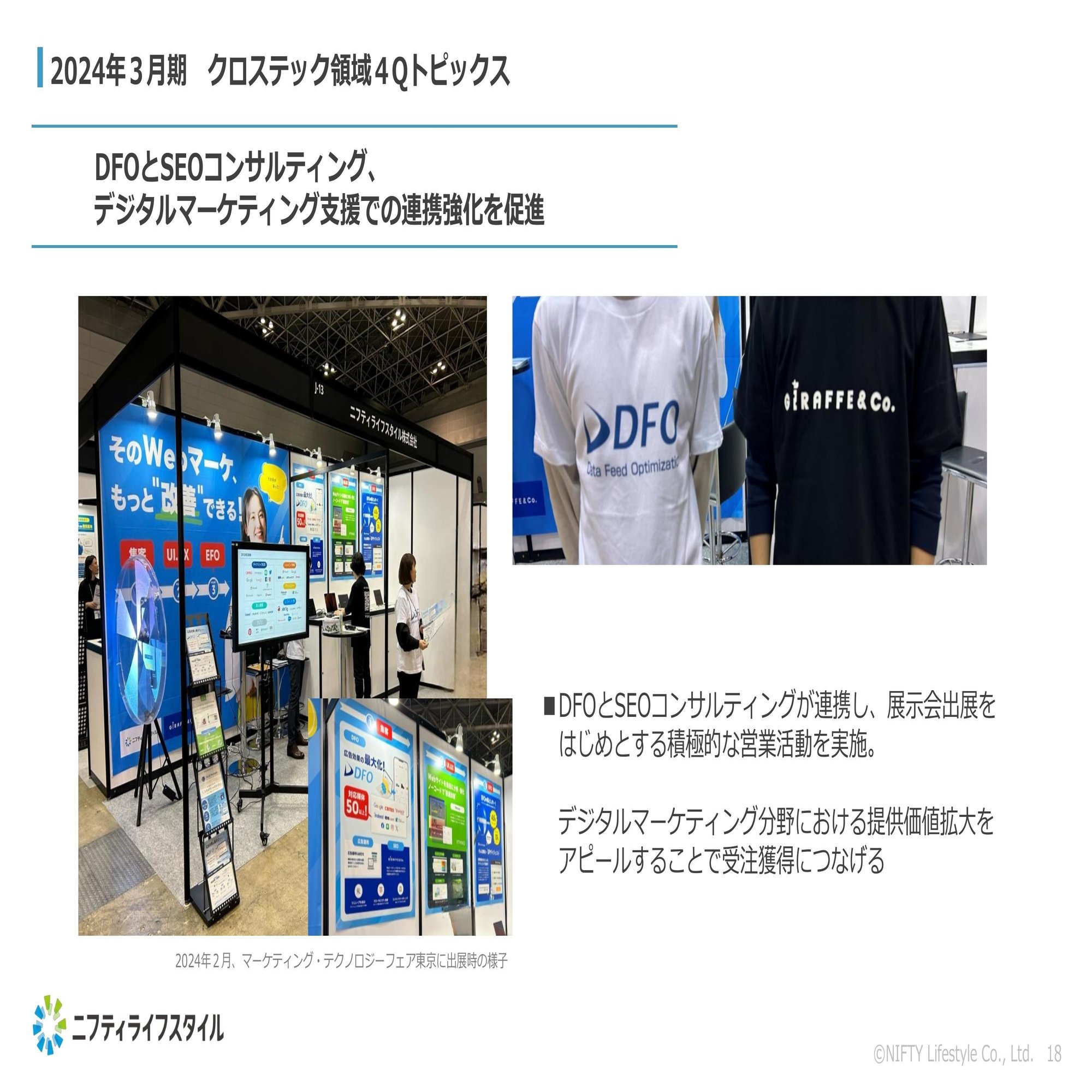 続きまして、クロステック領域の第4四半期トピックスにつきましては、この後説明する成長戦略にもつながっていくのですが、DFOとジラフ社でしっかり連携・コミュニケーションを強化して、デジタルマーケティング支援という課題に取り組んでいくと。その一環として、イベントへの登壇であったり各種連携強化を進めましたというところが、第4四半期のトピックスかなと考えております。