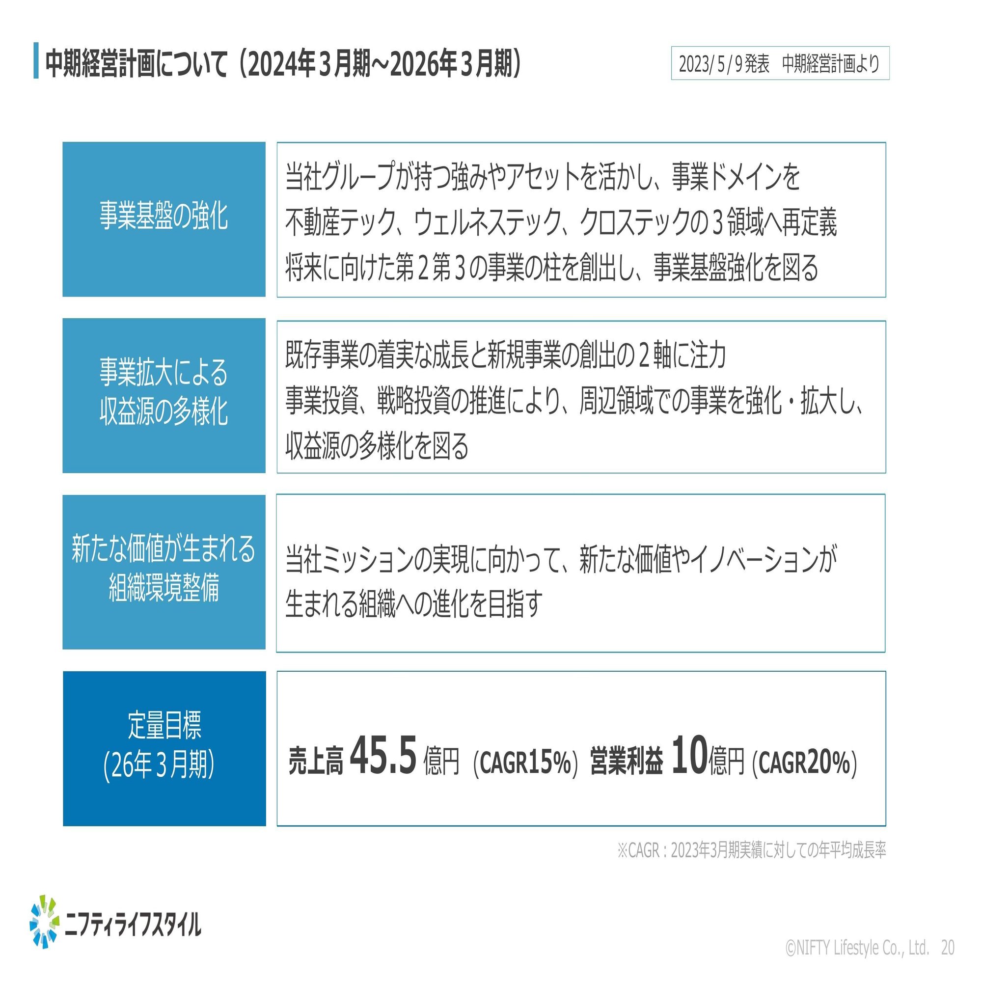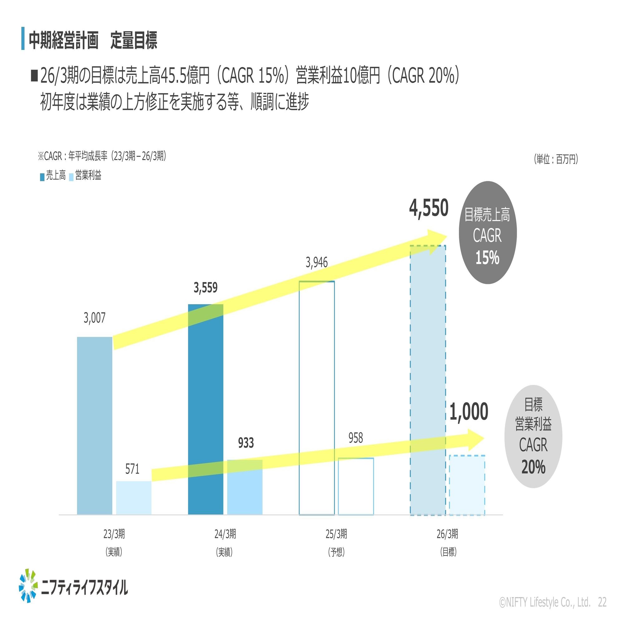 中期経営計画の目標としましては、終年度である2026年3月期に売上高45億円以上、営業利益10億円を達成するというコミットメントを市場の皆様に対してしているという状況でございます。