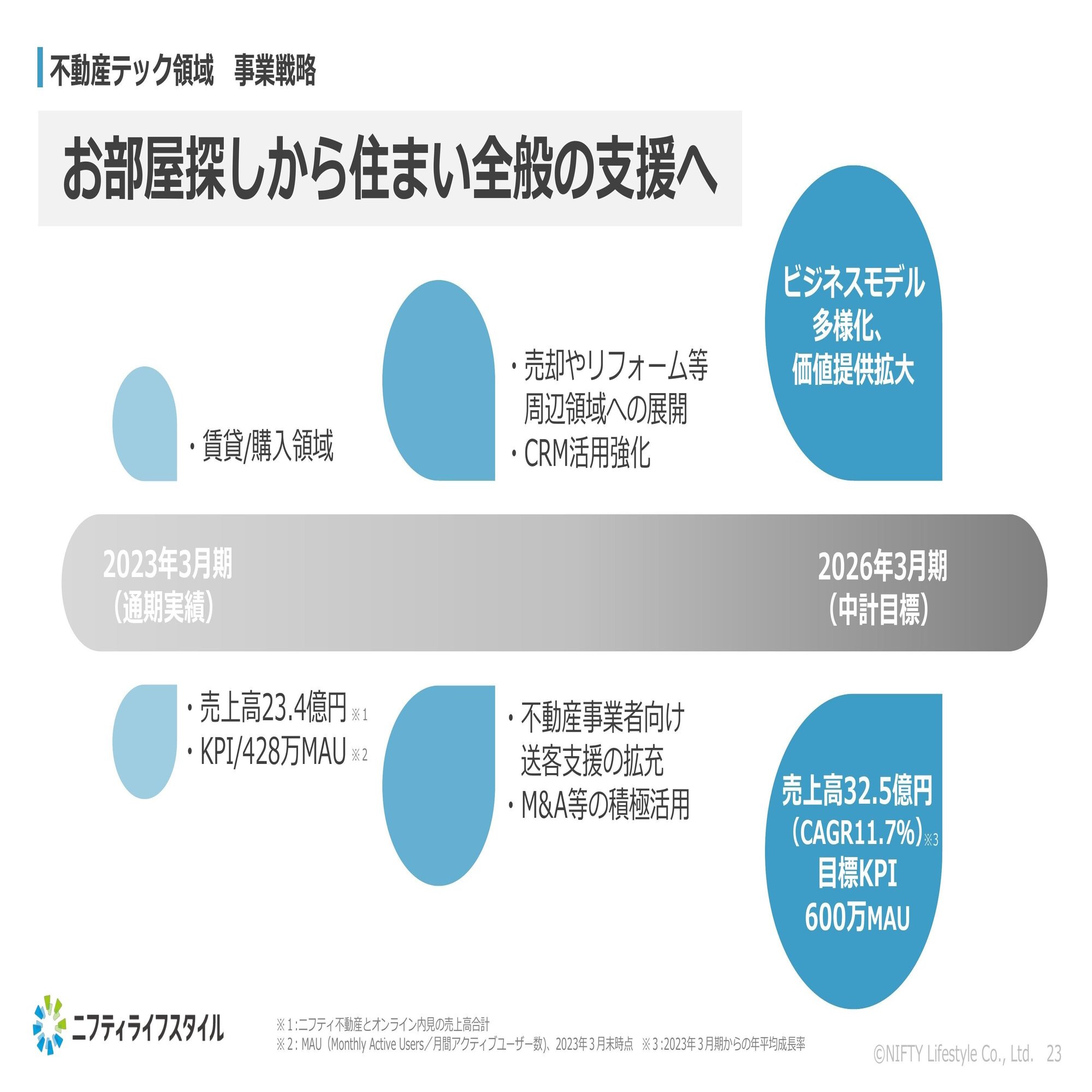 まず、不動産テックでは、お部屋探しから住まい全般の支援へと事業戦略を進めていきます。現状の主力であるニフティ不動産では、お部屋探し、特にお部屋を借りたい方の支援がメインとなっております。ここに周辺領域として、売却やリフォームの展開、取得したデータを活用したCRMの推進、不動産事業者様向けの送客支援の拡充などのアクションを検討しているという状況になっております。