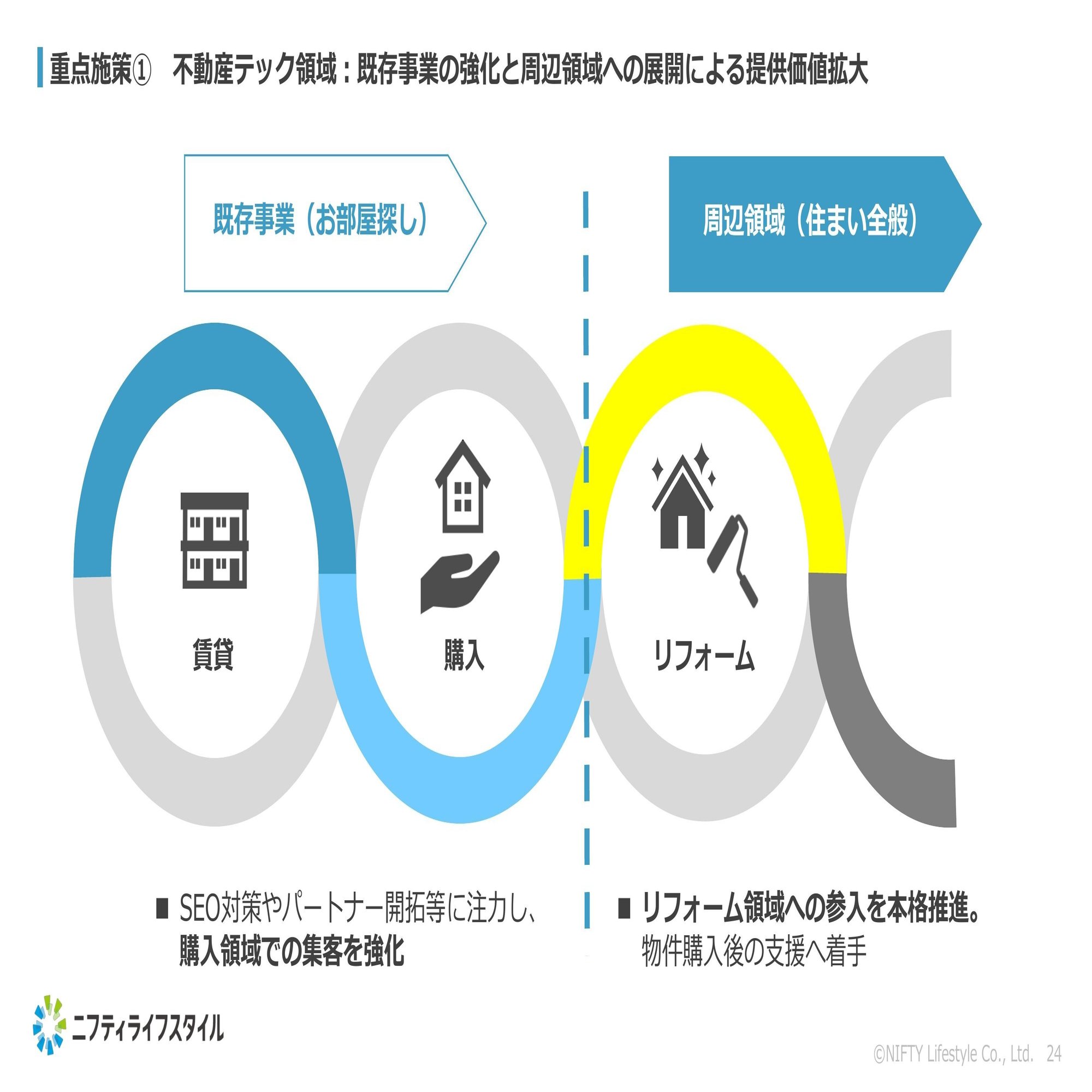 これに加えて、右側の住まい全般への支援として、周辺領域の事業開発を進めていくことが今期の戦略になっております。その中で当社としては、リフォーム領域に取り組むことを現在推進しております。こちらはニフティ不動産とのシナジーも十分考えられるため、周辺領域での展開をしっかりと進めてまいります。