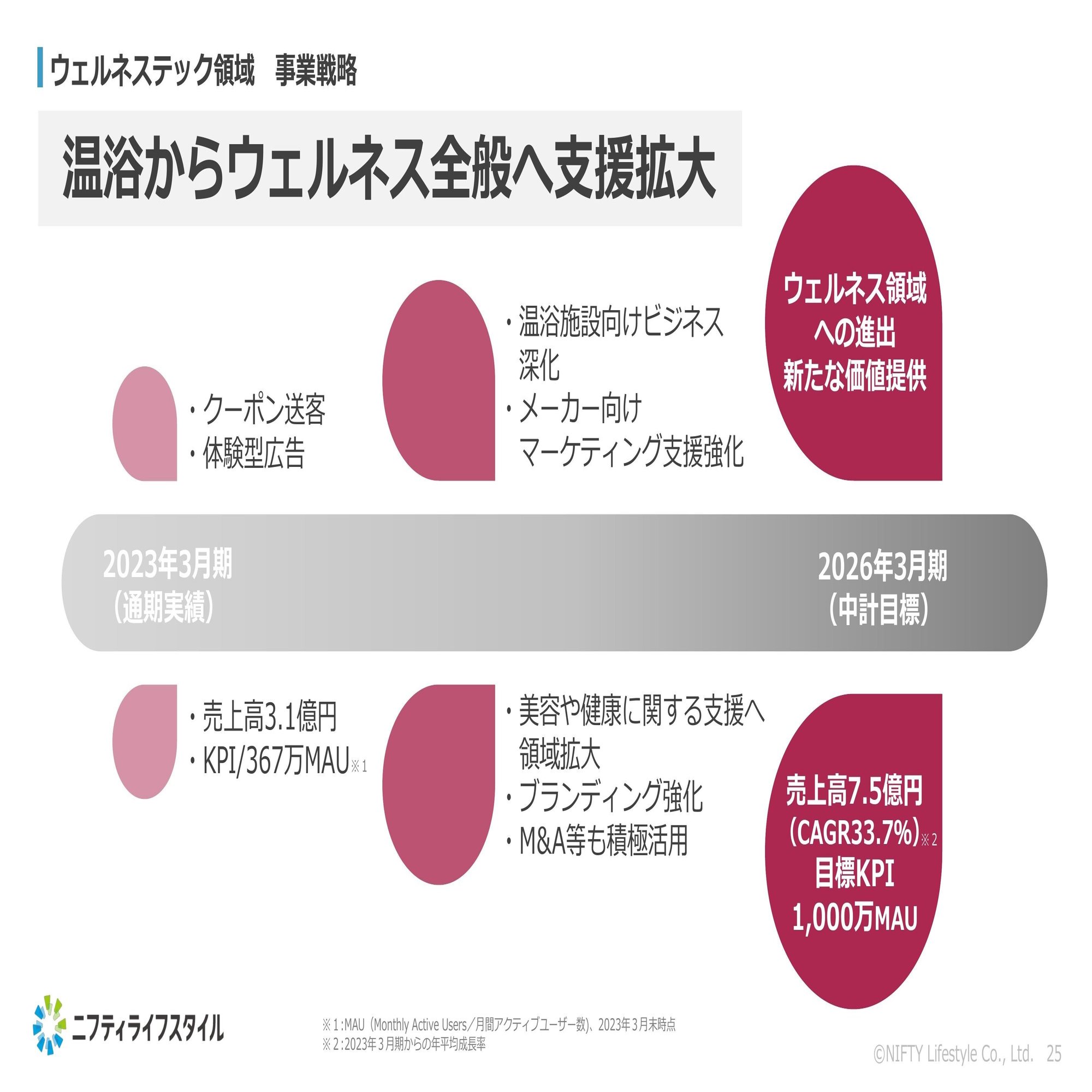 続いて、ウェルネステック領域の事業戦略です。こちらは現在、ニフティ温泉を中心に取り組んでおり、温浴ビジネスからウェルネス全般への支援拡大を目指す事業戦略を描いております。