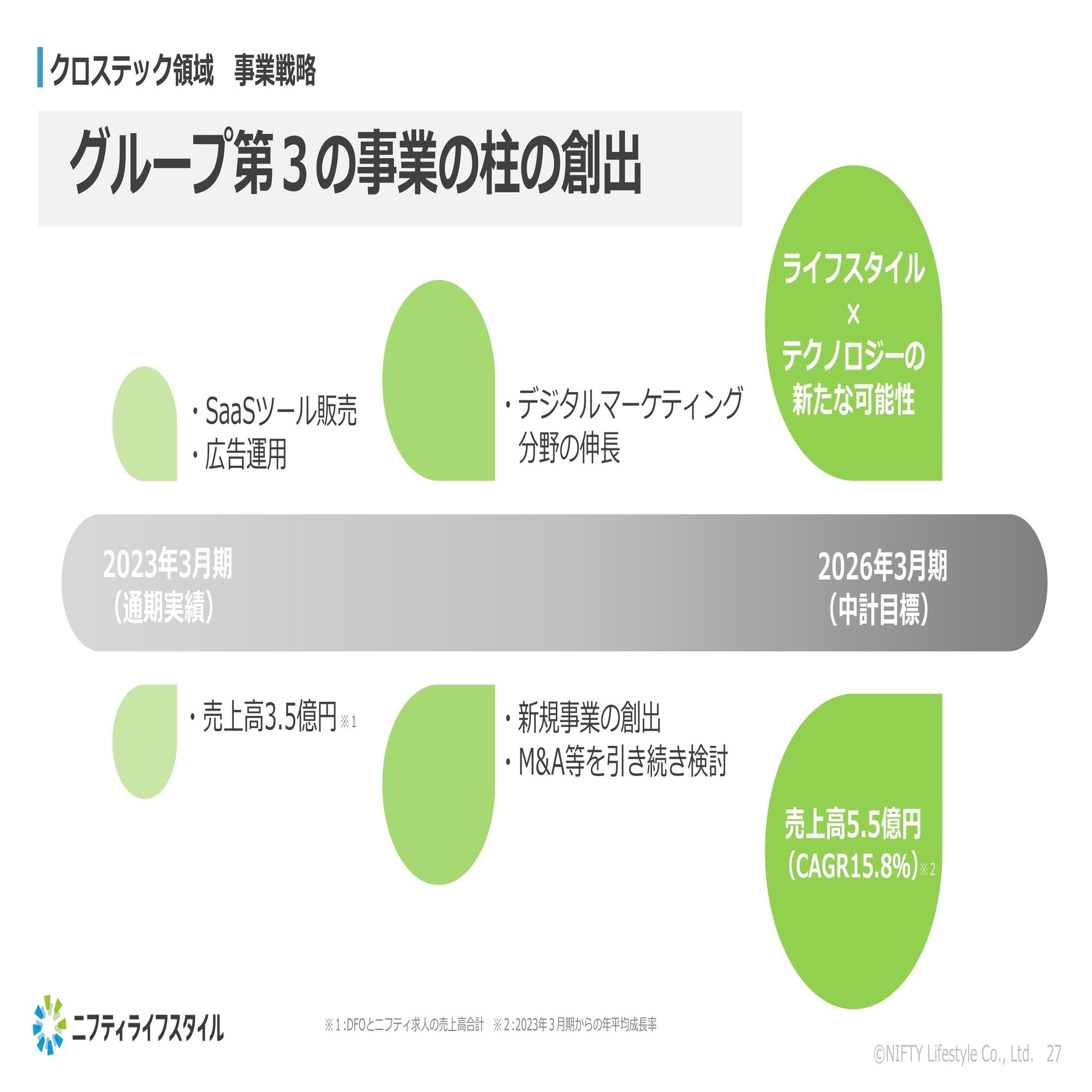 A. ニフティ不動産の伸びは計画上非常に重要ですが、それだけでは目標は実現できないと考えています。周辺領域の事業展開やウェルネステック、クロステックを第2第3の柱にしっかり伸ばしていくことが重要になります。