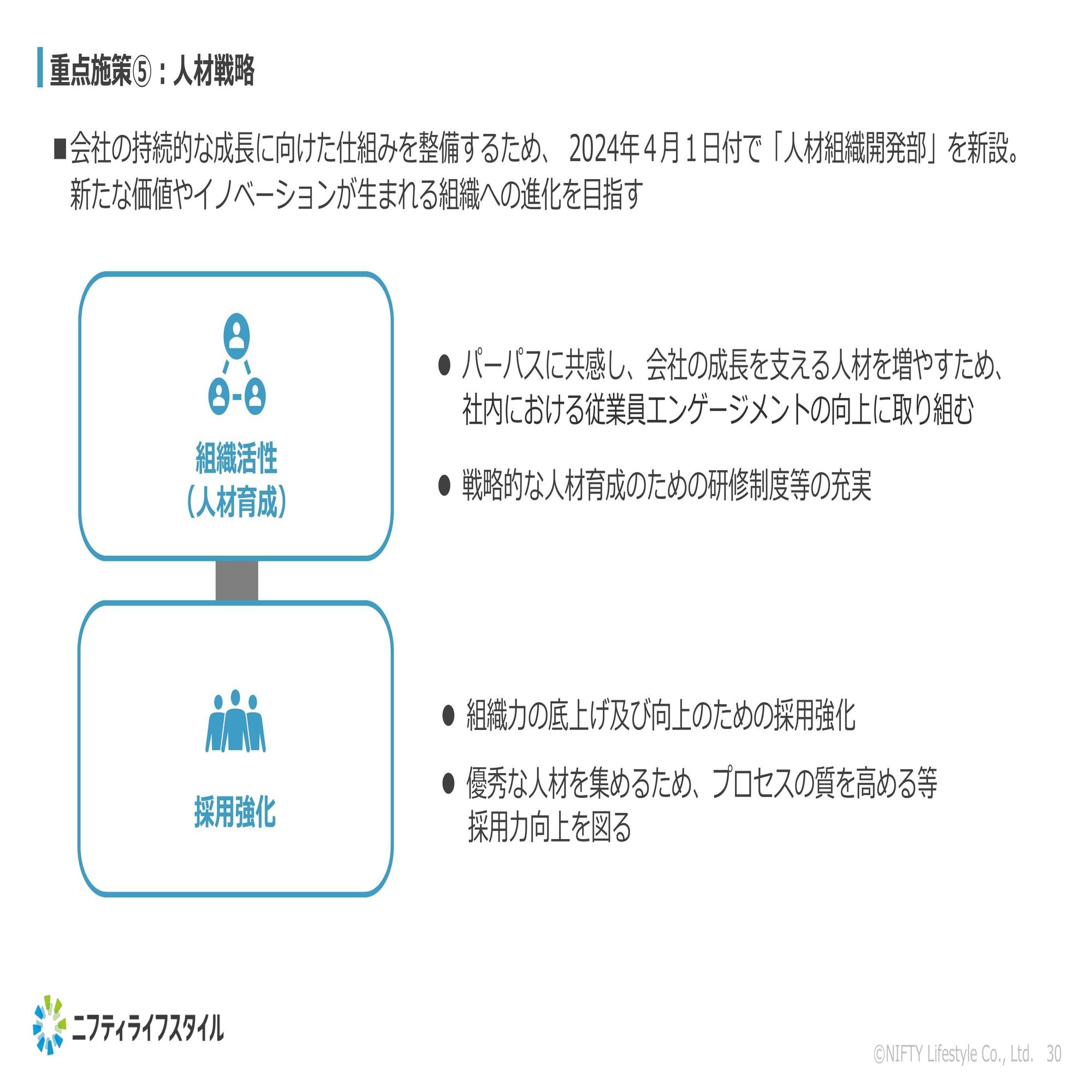 そこで、4月1日付で人材組織開発部という組織を新設しました。その中で、新たな価値やイノベーションが生まれる組織への進化を目指していきたいと考えております。具体的な取り組みとしては、採用強化と組織活性化を推進していく方針です。