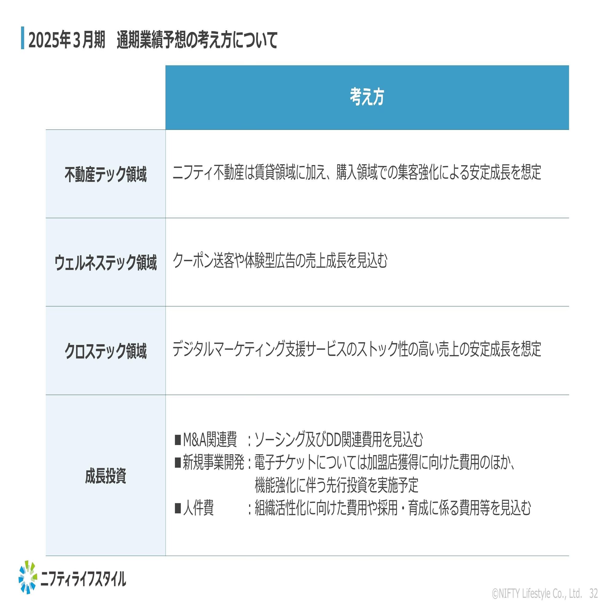 まず、通期業績予想の前提について簡単にまとめさせていただきました。不動産テック領域では、ニフティ不動産の賃貸に加えて購入領域の集客を強化することで、これまで同様の安定成長を続けていくという前提で業績予想を組んでいます。