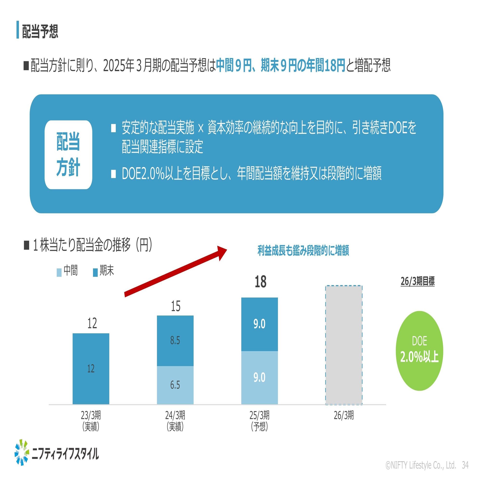 配当予想については、成長と還元のバランスを意識しながら、中間9円、期末9円、年間18円と前期から3円の増配を予定しております。