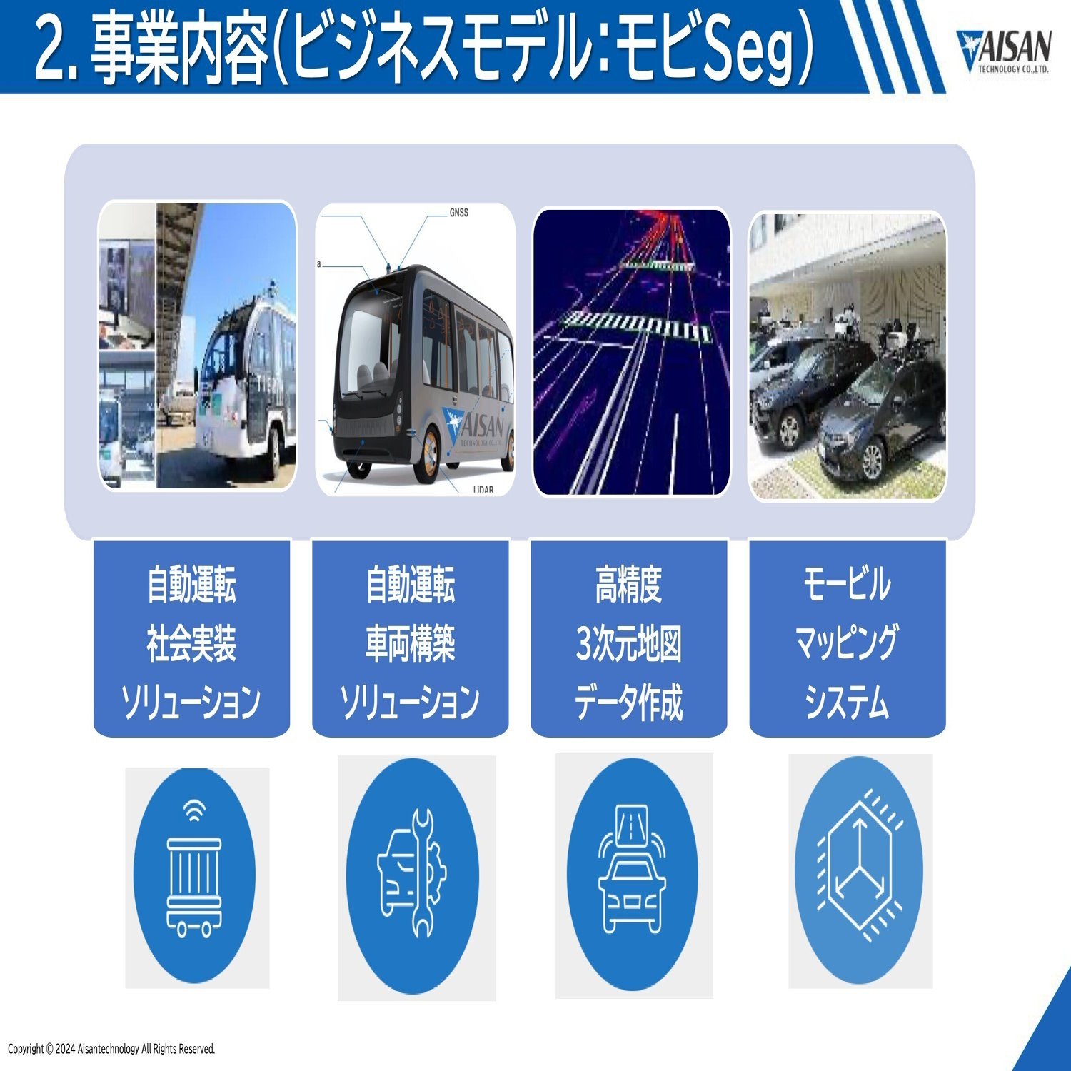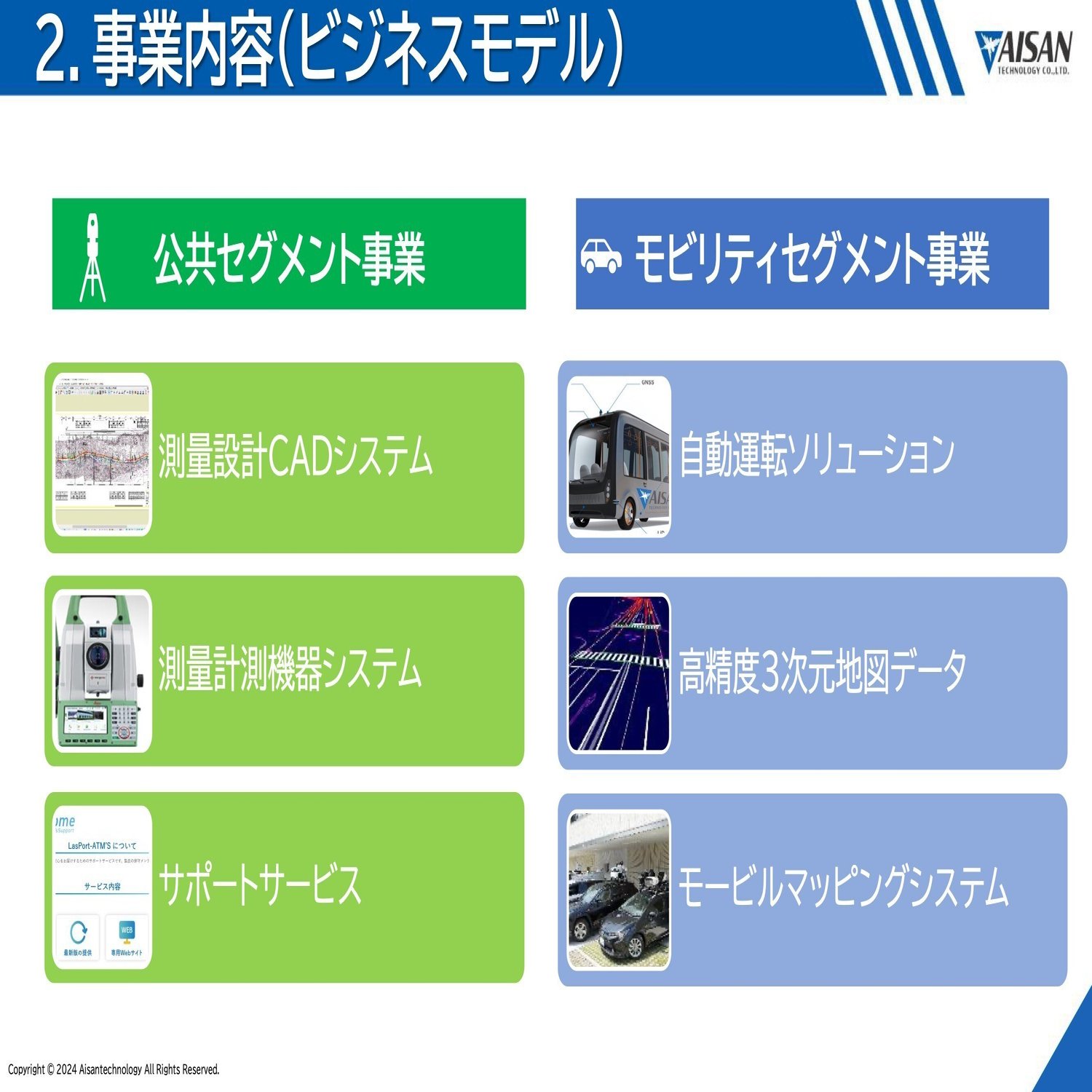 2つ目はモビリティセグメント事業で、自動運転を中心とした仕事をしているセグメントです。主にモービルマッピングシステムを用いた高精度3次元地図データの生成・販売、自動運転関連車両の構築、社会実装に向けた様々なコンサルティングなどの自動運転ソリューションが中心となっています。