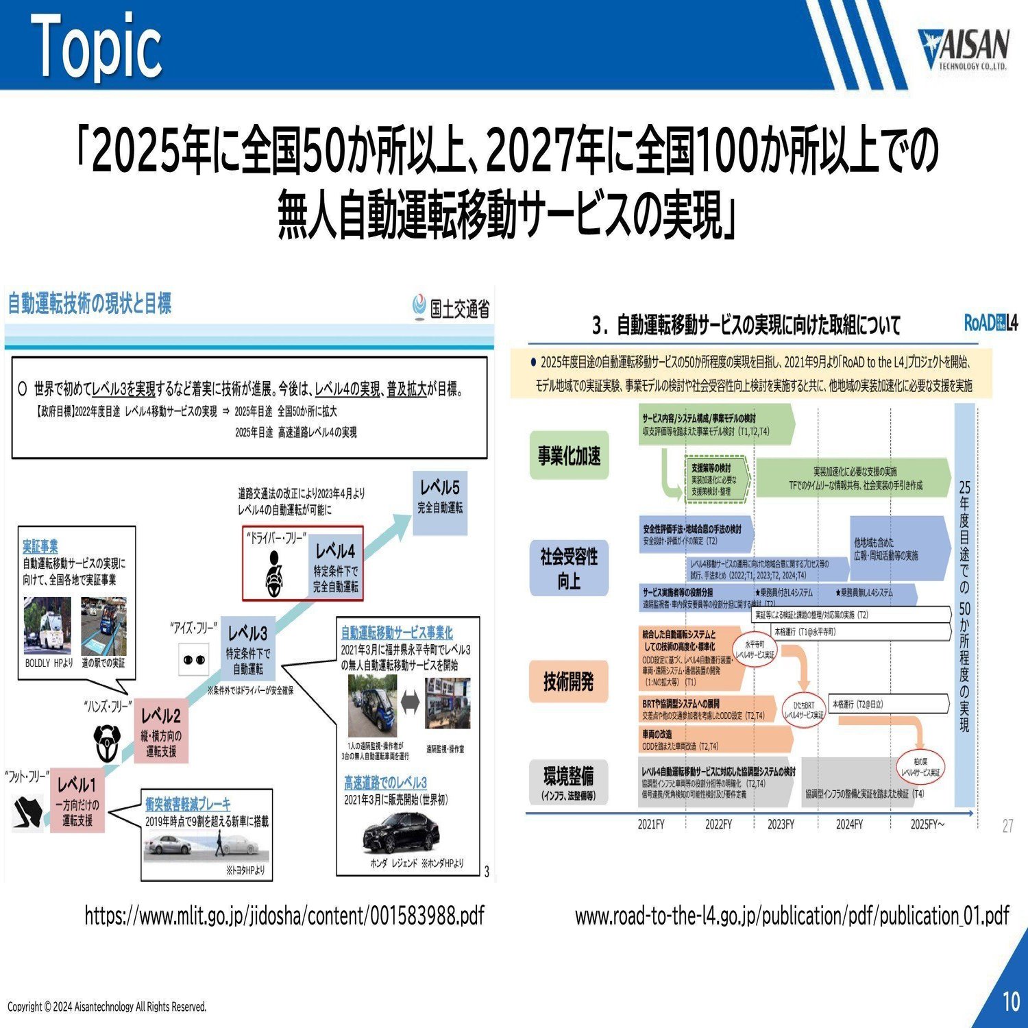 トピックとして、経済産業省と国土交通省が連携し、2025年までに全国50~100ヶ所で自動運転サービスを展開する「RoAD to the L4」の取り組みが活発化しています。特に2024年から2026年の3年間は、社会実装に向けた重要な期間になると見込んでいます。当社も限られたリソースを有効活用し、この分野に注力していきます。